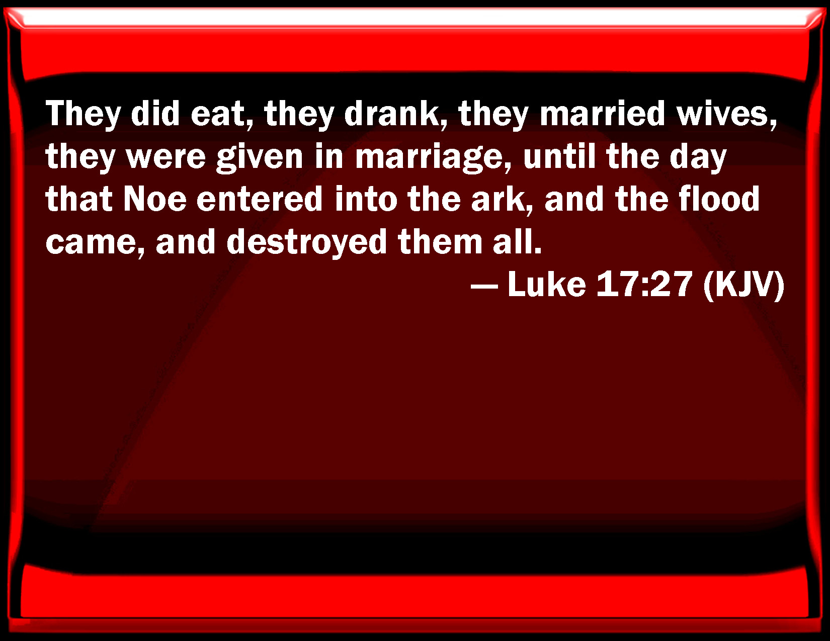 Bible Verse Slide Luke 17:27 They did eat, they drank, they married wives, they were given in marriage, until the day that Noe entered into the ark, and the flood came, and destroyed them all. KJV: They did eat, they drank, they married wives, they were given in marriage, until the day that Noe entered into the ark, and the flood came, and destroyed them all. DRB: They did eat and drink, they married wives, and were given in marriage, until the day that Noe entered into the ark: and the flood came and destroyed them all. DBT: they ate, they drank, they married, they were given in marriage, until the day that Noe entered into the ark, and the flood came and destroyed all of them; ERV: They ate, they drank, they married, they were given in marriage, until the day that Noah entered into the ark, and the flood came, and destroyed them all. WBT: They ate, they drank, they married wives, they were given in marriage, until the day that Noah entered into the ark; and the flood came, and destroyed them all. WEB: They ate, they drank, they married, they were given in marriage, until the day that Noah entered into the ship, and the flood came, and destroyed them all. YLT: they were eating, they were drinking, they were marrying, they were given in marriage, till the day that Noah entered into the ark, and the deluge came, and destroyed all;Links Luke 17:27 NIV • Luke 17:27 NLT • Luke 17:27 ESV • Luke 17:27 NASB • Luke 17:27 KJV • Luke 17:27 Interlinear • Luke 17:27 Commentaries • Luke 17:27 Parallel Texts • Luke 17:27 Bible Apps • Luke 17:27 Parallel • Bible Hub |