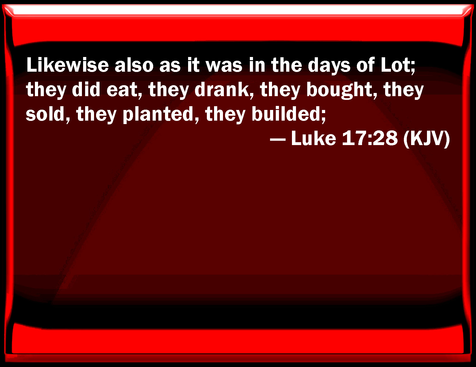 Bible Verse Slide Luke 17:28 Likewise also as it was in the days of Lot; they did eat, they drank, they bought, they sold, they planted, they built; KJV: Likewise also as it was in the days of Lot; they did eat, they drank, they bought, they sold, they planted, they builded; DRB: Likewise as it came to pass, in the days of Lot: they did eat and drink, they bought and sold, they planted and built. DBT: and in like manner as took place in the days of Lot: they ate, they drank, they bought, they sold, they planted, they builded; ERV: Likewise even as it came to pass in the days of Lot; they ate, they drank, they bought, they sold, they planted, they builded; WBT: Likewise also as it was in the days of Lot: they ate, they drank, they bought, they sold, they planted, they built; WEB: Likewise, even as it happened in the days of Lot: they ate, they drank, they bought, they sold, they planted, they built; YLT: in like manner also, as it came to pass in the days of Lot; they were eating, they were drinking, they were buying, they were selling, they were planting, they were building;Links Luke 17:28 NIV • Luke 17:28 NLT • Luke 17:28 ESV • Luke 17:28 NASB • Luke 17:28 KJV • Luke 17:28 Interlinear • Luke 17:28 Commentaries • Luke 17:28 Parallel Texts • Luke 17:28 Bible Apps • Luke 17:28 Parallel • Bible Hub |