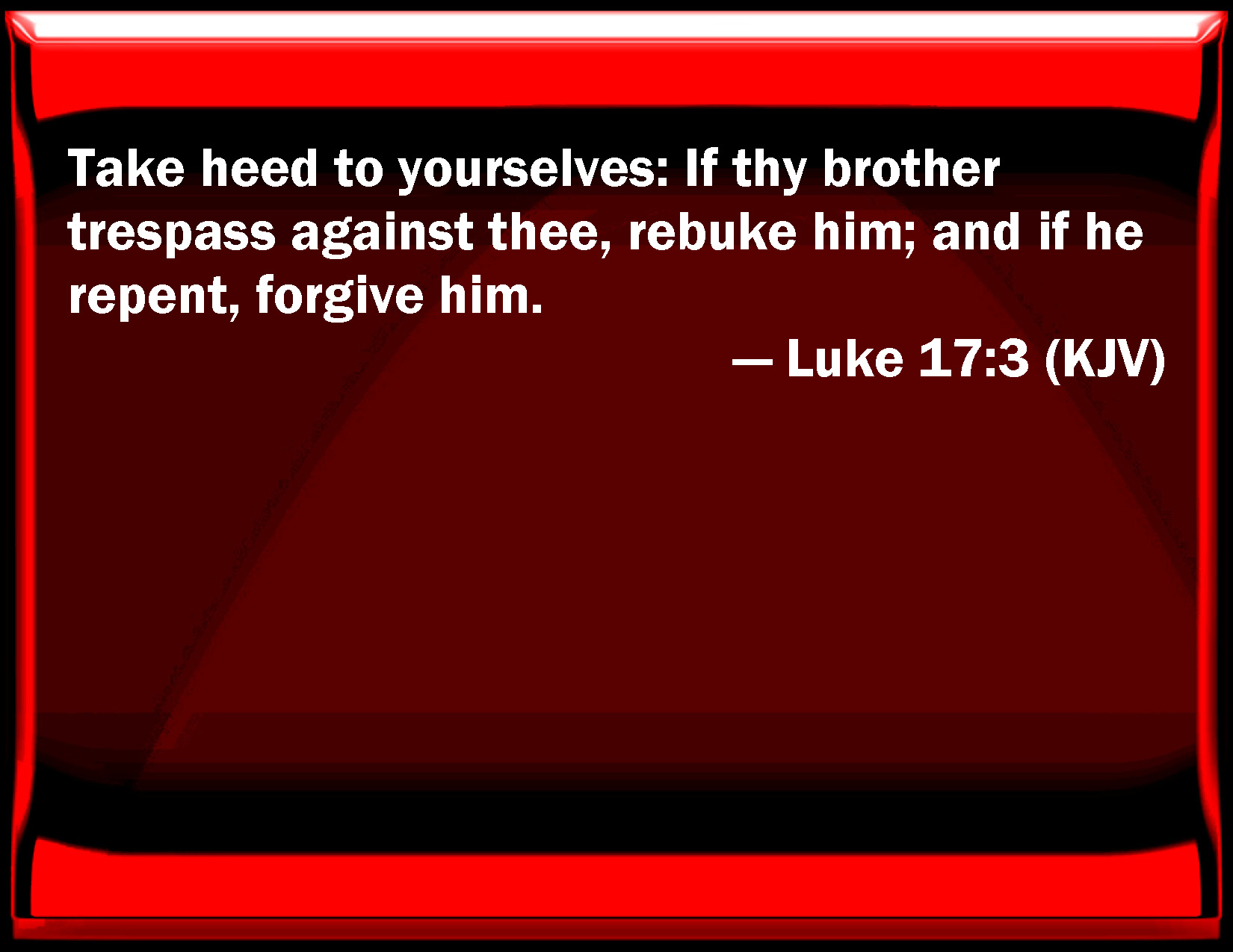 Bible Verse Slide Luke 17:3 Take heed to yourselves: If your brother trespass against you, rebuke him; and if he repent, forgive him. KJV: Take heed to yourselves: If thy brother trespass against thee, rebuke him; and if he repent, forgive him. DRB: Take heed to yourselves. If thy brother sin against thee, reprove him: and if he do penance, forgive him. DBT: Take heed to yourselves: if thy brother should sin, rebuke him; and if he should repent, forgive him. ERV: Take heed to yourselves: if thy brother sin, rebuke him; and if he repent, forgive him. WBT: Take heed to yourselves: If thy brother shall trespass against thee, rebuke him; and if he shall repent forgive him. WEB: Be careful. If your brother sins against you, rebuke him. If he repents, forgive him. YLT: 'Take heed to yourselves, and, if thy brother may sin in regard to thee, rebuke him, and if he may reform, forgive him,Links Luke 17:3 NIV • Luke 17:3 NLT • Luke 17:3 ESV • Luke 17:3 NASB • Luke 17:3 KJV • Luke 17:3 Interlinear • Luke 17:3 Commentaries • Luke 17:3 Parallel Texts • Luke 17:3 Bible Apps • Luke 17:3 Parallel • Bible Hub |