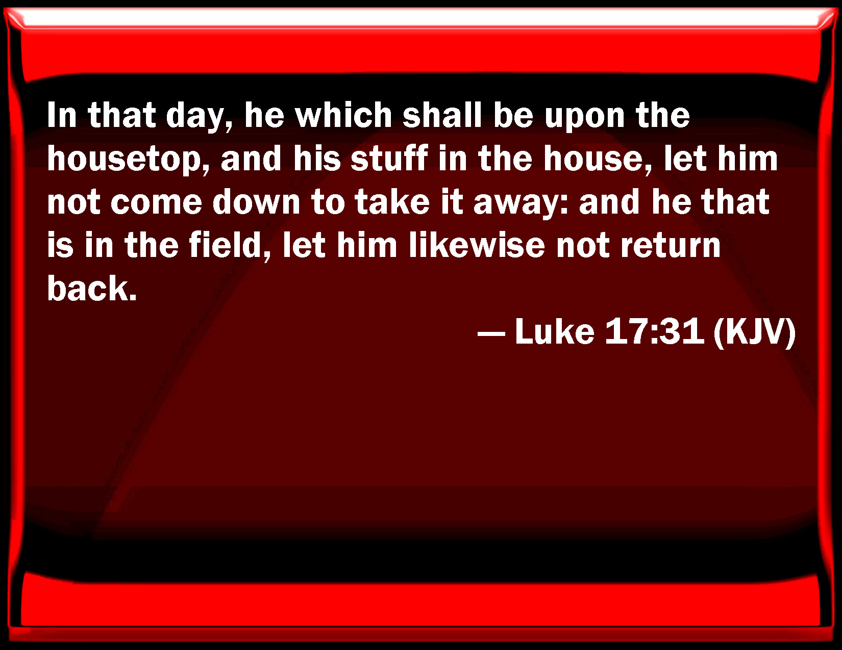 Bible Verse Slide Luke 17:31 In that day, he which shall be on the housetop, and his stuff in the house, let him not come down to take it away: and he that is in the field, let him likewise not return back. KJV: In that day, he which shall be upon the housetop, and his stuff in the house, let him not come down to take it away: and he that is in the field, let him likewise not return back. DRB: In that hour, he that shall be on the housetop, and his goods in the house, let him not go down to take them away: and he that shall be in the field, in like manner, let him not return back. DBT: In that day, he who shall be on the housetop, and his stuff in the house, let him not go down to take it away; and he that is in the field, let him likewise not return back. ERV: In that day, he which shall be on the housetop, and his goods in the house, let him not go down to take them away: and let him that is in the field likewise not return back. WBT: In that day, he who shall be upon the house-top, and his furniture in the house, let him not come down to take it away: and he that is in the field, let him likewise not return back. WEB: In that day, he who will be on the housetop, and his goods in the house, let him not go down to take them away. Let him who is in the field likewise not turn back. YLT: in that day, he who shall be on the house top, and his vessels in the house, let him not come down to take them away; and he in the field, in like manner, let him not turn backward;Links Luke 17:31 NIV • Luke 17:31 NLT • Luke 17:31 ESV • Luke 17:31 NASB • Luke 17:31 KJV • Luke 17:31 Interlinear • Luke 17:31 Commentaries • Luke 17:31 Parallel Texts • Luke 17:31 Bible Apps • Luke 17:31 Parallel • Bible Hub |