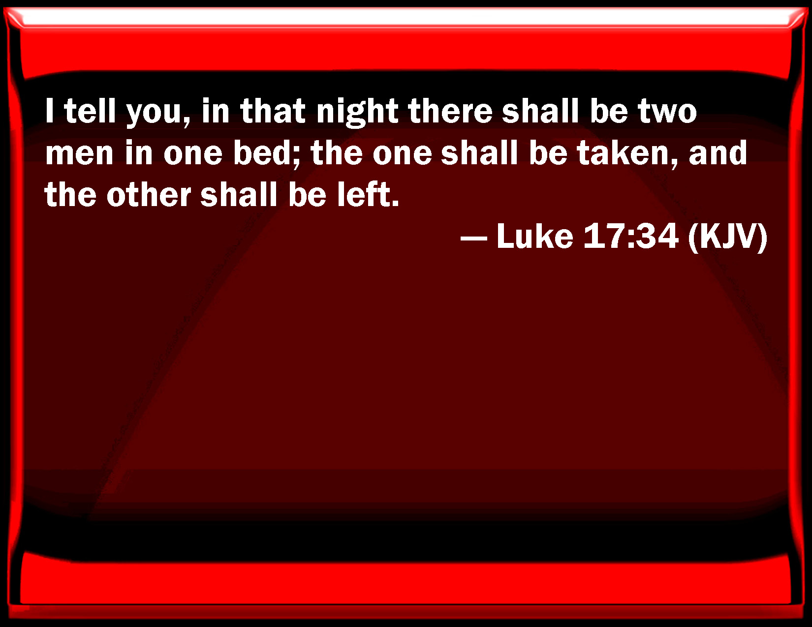 Bible Verse Slide Luke 17:34 I tell you, in that night there shall be two men in one bed; the one shall be taken, and the other shall be left. KJV: I tell you, in that night there shall be two men in one bed; the one shall be taken, and the other shall be left. DRB: I say to you: in that night there shall be two men in one bed; the one shall be taken, and the other shall be left. DBT: I say to you, In that night there shall be two men upon one bed; one shall be seized and the other shall be let go. ERV: I say unto you, In that night there shall be two men on one bed; the one shall be taken, and the other shall be left. WBT: I tell you, in that night there will be two men in one bed; the one will be taken, and the other will be left. WEB: I tell you, in that night there will be two people in one bed. The one will be taken, and the other will be left. YLT: 'I say to you, In that night, there shall be two men on one couch, the one shall be taken, and the other shall be left;Links Luke 17:34 NIV • Luke 17:34 NLT • Luke 17:34 ESV • Luke 17:34 NASB • Luke 17:34 KJV • Luke 17:34 Interlinear • Luke 17:34 Commentaries • Luke 17:34 Parallel Texts • Luke 17:34 Bible Apps • Luke 17:34 Parallel • Bible Hub |