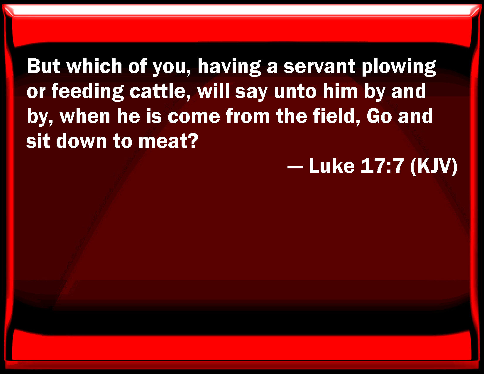 Bible Verse Slide Luke 17:7 But which of you, having a servant plowing or feeding cattle, will say to him by and by, when he is come from the field, Go and sit down to meat? KJV: But which of you, having a servant plowing or feeding cattle, will say unto him by and by, when he is come from the field, Go and sit down to meat? DRB: But which of you having a servant ploughing, or feeding cattle, will say to him, when he is come from the field: Immediately go, sit down to meat: DBT: But which of you is there who, having a bondman ploughing or shepherding, when he comes in out of the field, will say, Come and lie down immediately to table? ERV: But who is there of you, having a servant plowing or keeping sheep, that will say unto him, when he is come in from the field, Come straightway and sit down to meat; WBT: But which of you having a servant plowing, or feeding cattle, will say to him immediately, when he is come from the field, Go and sit down to eat? WEB: But who is there among you, having a servant plowing or keeping sheep, that will say, when he comes in from the field, 'Come immediately and sit down at the table,' YLT: But, who is he of you — having a servant ploughing or feeding — who, to him having come in out of the field, will say, Having come near, recline at meat?Links Luke 17:7 NIV • Luke 17:7 NLT • Luke 17:7 ESV • Luke 17:7 NASB • Luke 17:7 KJV • Luke 17:7 Interlinear • Luke 17:7 Commentaries • Luke 17:7 Parallel Texts • Luke 17:7 Bible Apps • Luke 17:7 Parallel • Bible Hub |