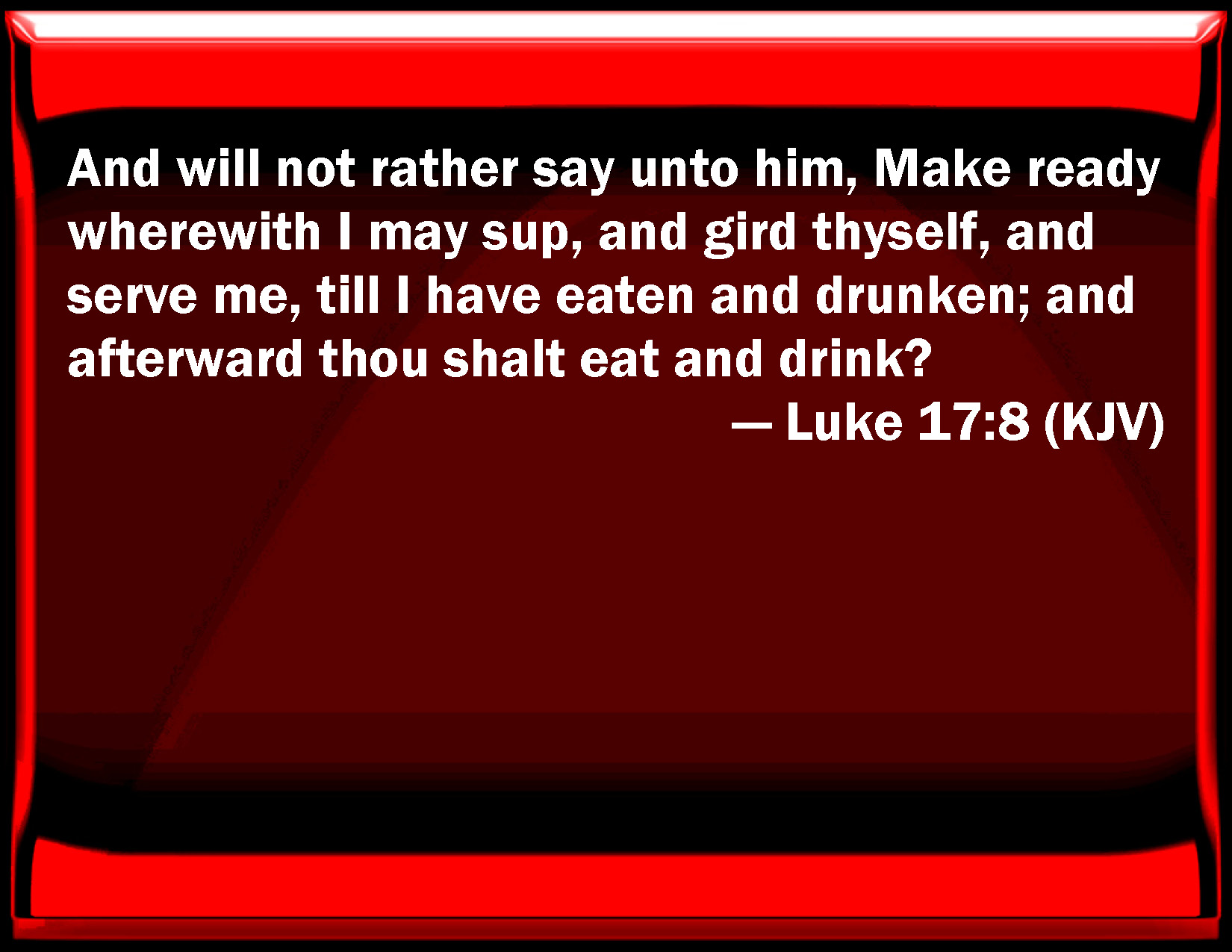 Bible Verse Slide Luke 17:8 And will not rather say to him, Make ready with which I may sup, and gird yourself, and serve me, till I have eaten and drunken; and afterward you shall eat and drink? KJV: And will not rather say unto him, Make ready wherewith I may sup, and gird thyself, and serve me, till I have eaten and drunken; and afterward thou shalt eat and drink? DRB: And will not rather say to him: Make ready my supper, and gird thyself, and serve me, whilst I eat and drink, and afterwards thou shalt eat and drink? DBT: But will he not say to him, Prepare what I shall sup on, and gird thyself and serve me that I may eat and drink; and after that thou shalt eat and drink? ERV: and will not rather say unto him, Make ready wherewith I may sup, and gird thyself, and serve me, till I have eaten and drunken; and afterward thou shalt eat and drink? WBT: And will not rather say to him, Make ready wherewith I may sup, and gird thyself, and serve me, till I have eaten and drank; and afterward thou shalt eat and drink? WEB: and will not rather tell him, 'Prepare my supper, clothe yourself properly, and serve me, while I eat and drink. Afterward you shall eat and drink'? YLT: but will not rather say to him, Prepare what I may sup, and having girded thyself about, minister to me, till I eat and drink, and after these things thou shalt eat and drink?Links Luke 17:8 NIV • Luke 17:8 NLT • Luke 17:8 ESV • Luke 17:8 NASB • Luke 17:8 KJV • Luke 17:8 Interlinear • Luke 17:8 Commentaries • Luke 17:8 Parallel Texts • Luke 17:8 Bible Apps • Luke 17:8 Parallel • Bible Hub |
