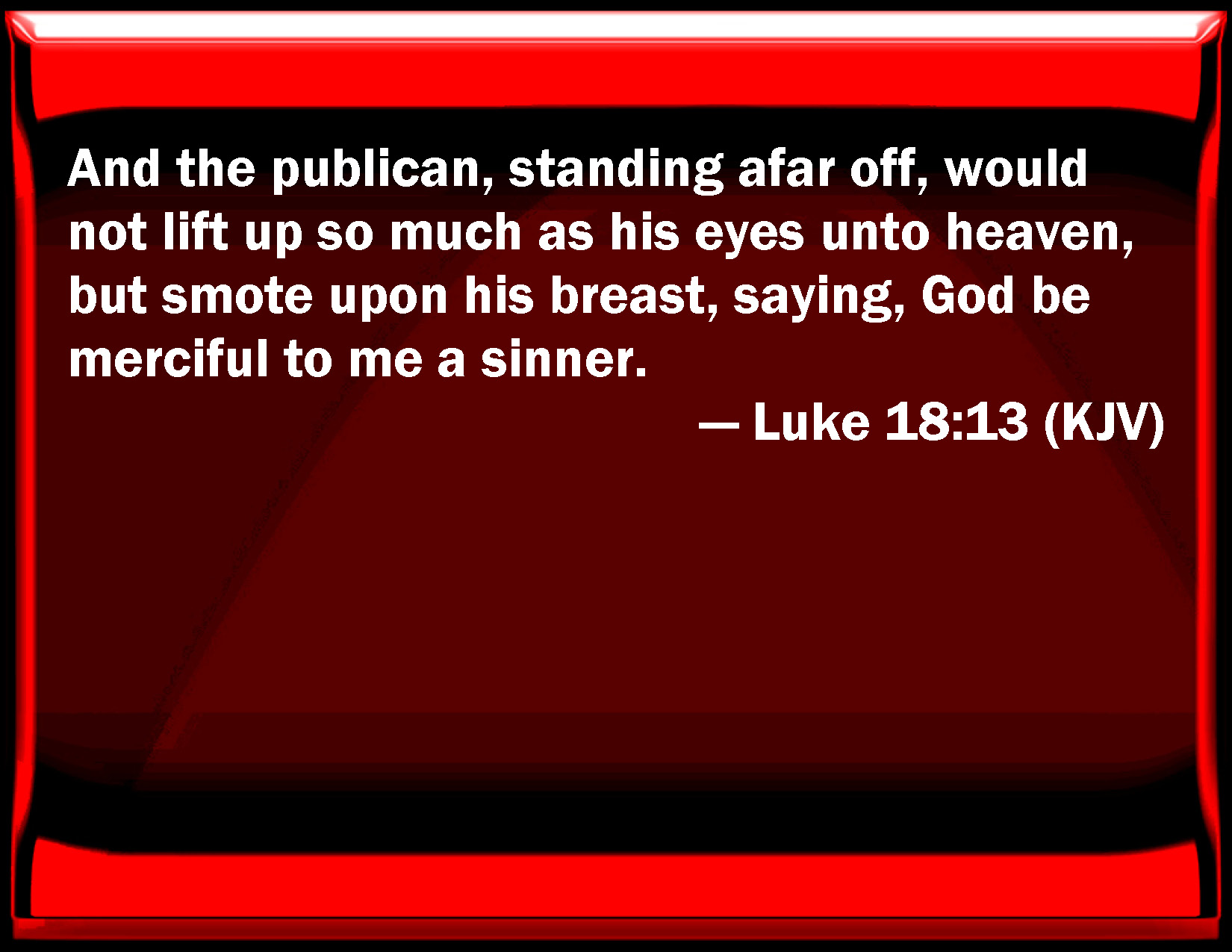 Bible Verse Slide Luke 18:13 And the publican, standing afar off, would not lift up so much as his eyes to heaven, but smote on his breast, saying, God be merciful to me a sinner. KJV: And the publican, standing afar off, would not lift up so much as his eyes unto heaven, but smote upon his breast, saying, God be merciful to me a sinner. DRB: And the publican, standing afar off, would not so much as lift up his eyes towards heaven; but struck his breast, saying: O god, be merciful to me a sinner. DBT: And the tax-gatherer, standing afar off, would not lift up even his eyes to heaven, but smote upon his breast, saying, O God, have compassion on me, the sinner. ERV: But the publican, standing afar off, would not lift up so much as his eyes unto heaven, but smote his breast, saying, God, be merciful to me a sinner. WBT: And the publican, standing afar off, would not lift up so much as his eyes to heaven, but smote upon his breast, saying, God be merciful to me a sinner. WEB: But the tax collector, standing far away, wouldn't even lift up his eyes to heaven, but beat his breast, saying, 'God, be merciful to me, a sinner!' YLT: And the tax-gatherer, having stood afar off, would not even the eyes lift up to the heaven, but was smiting on his breast, saying, God be propitious to me — the sinner!Links Luke 18:13 NIV • Luke 18:13 NLT • Luke 18:13 ESV • Luke 18:13 NASB • Luke 18:13 KJV • Luke 18:13 Interlinear • Luke 18:13 Commentaries • Luke 18:13 Parallel Texts • Luke 18:13 Bible Apps • Luke 18:13 Parallel • Bible Hub |