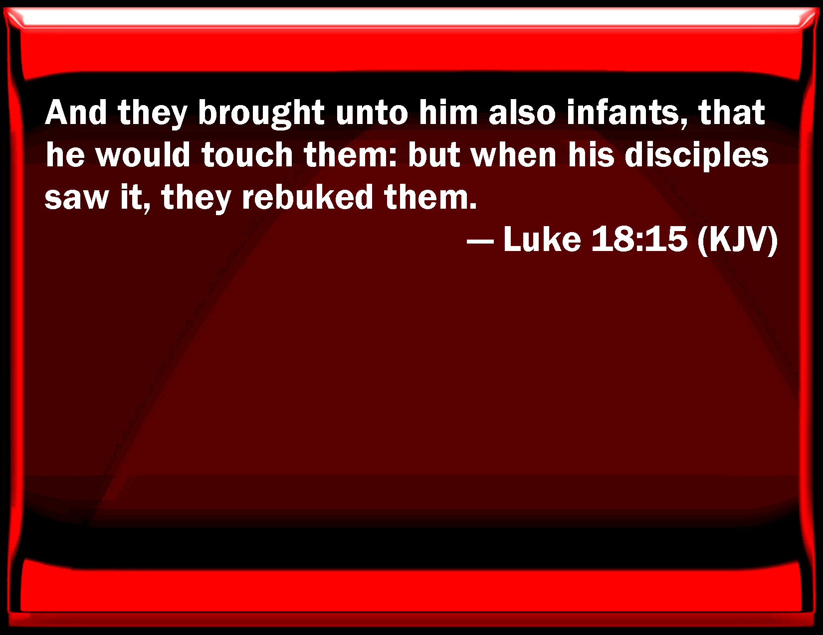 Bible Verse Slide Luke 18:15 And they brought to him also infants, that he would touch them: but when his disciples saw it, they rebuked them. KJV: And they brought unto him also infants, that he would touch them: but when his disciples saw it, they rebuked them. DRB: And they brought unto him also infants, that he might touch them. Which when the disciples saw, they rebuked them. DBT: And they brought to him also infants that he might touch them, but the disciples when they saw it rebuked them. ERV: And they brought unto him also their babes, that he should touch them: but when the disciples saw it, they rebuked them. WBT: And they brought to him also infants, that he would touch them: but when his disciples saw it, they rebuked them. WEB: They were also bringing their babies to him, that he might touch them. But when the disciples saw it, they rebuked them. YLT: And they were bringing near also the babes, that he may touch them, and the disciples having seen did rebuke them,Links Luke 18:15 NIV • Luke 18:15 NLT • Luke 18:15 ESV • Luke 18:15 NASB • Luke 18:15 KJV • Luke 18:15 Interlinear • Luke 18:15 Commentaries • Luke 18:15 Parallel Texts • Luke 18:15 Bible Apps • Luke 18:15 Parallel • Bible Hub |
