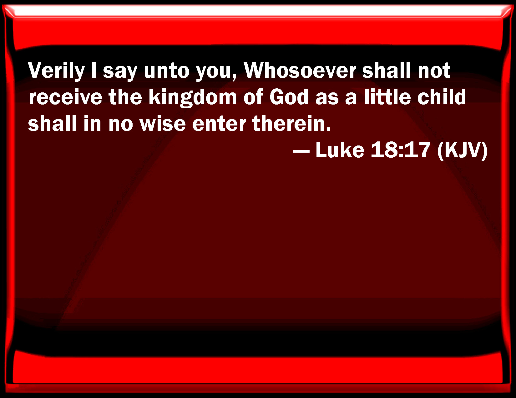Bible Verse Slide Luke 18:17 Truly I say to you, Whoever shall not receive the kingdom of God as a little child shall in no wise enter therein. KJV: Verily I say unto you, Whosoever shall not receive the kingdom of God as a little child shall in no wise enter therein. DRB: Amen, I say to you: Whosoever shall not receive the kingdom of God as a child, shall not enter into it. DBT: Verily I say to you, Whosoever shall not receive the kingdom of God as a little child shall in no wise enter therein. ERV: Verily I say unto you, Whosoever shall not receive the kingdom of God as a little child, he shall in no wise enter therein. WBT: Verily I say to you, Whoever shall not receive the kingdom of God as a little child, shall in no wise enter into it. WEB: Most certainly, I tell you, whoever doesn't receive the Kingdom of God like a little child, he will in no way enter into it." YLT: verily I say to you, Whoever may not receive the reign of God as a little child, may not enter into it.'Links Luke 18:17 NIV • Luke 18:17 NLT • Luke 18:17 ESV • Luke 18:17 NASB • Luke 18:17 KJV • Luke 18:17 Interlinear • Luke 18:17 Commentaries • Luke 18:17 Parallel Texts • Luke 18:17 Bible Apps • Luke 18:17 Parallel • Bible Hub |