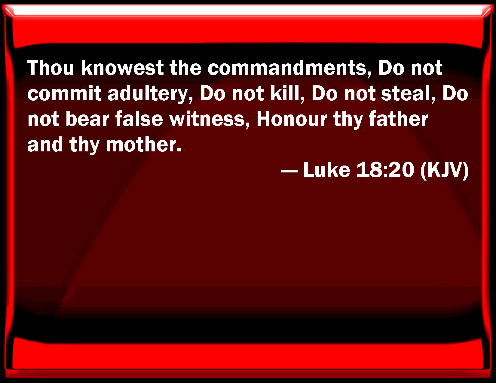 Bible Verse Slide Luke 18:20 You know the commandments, Do not commit adultery, Do not kill, Do not steal, Do not bear false witness, Honor your father and your mother. KJV: Thou knowest the commandments, Do not commit adultery, Do not kill, Do not steal, Do not bear false witness, Honour thy father and thy mother. DRB: Thou knowest the commandments: Thou shalt not kill: Thou shalt not commit adultery: Thou shalt not steal: Thou shalt not bear false witness: Honour thy father and mother. DBT: Thou knowest the commandments: Do not commit adultery, Do not kill, Do not steal, Do not bear false witness, Honour thy father and thy mother. ERV: Thou knowest the commandments, Do not commit adultery, Do not kill, Do not steal, Do not bear false witness, Honour thy father and mother. WBT: Thou knowest the commandments, Do not commit adultery, Do not kill, Do not steal, Do not bear false witness, Honor thy father and thy mother. WEB: You know the commandments: 'Don't commit adultery,' 'Don't murder,' 'Don't steal,' 'Don't give false testimony,' 'Honor your father and your mother.'" YLT: the commands thou hast known: Thou mayest not commit adultery, Thou mayest do no murder, Thou mayest not steal, Thou mayest not bear false witness, Honour thy father and thy mother.'Links Luke 18:20 NIV • Luke 18:20 NLT • Luke 18:20 ESV • Luke 18:20 NASB • Luke 18:20 KJV • Luke 18:20 Interlinear • Luke 18:20 Commentaries • Luke 18:20 Parallel Texts • Luke 18:20 Bible Apps • Luke 18:20 Parallel • Bible Hub |