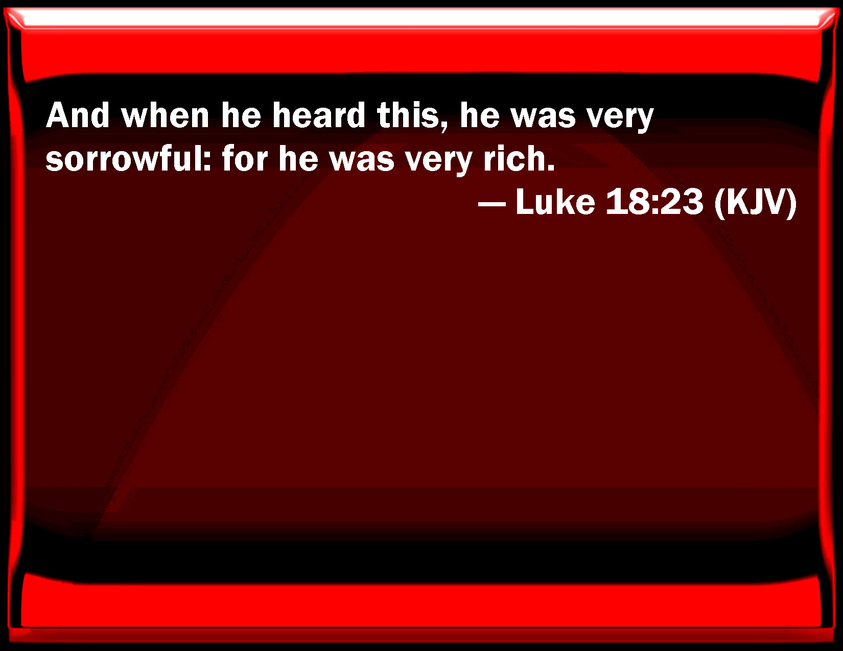 Bible Verse Slide Luke 18:23 And when he heard this, he was very sorrowful: for he was very rich. KJV: And when he heard this, he was very sorrowful: for he was very rich. DRB: He having heard these things, became sorrowful; for he was very rich. DBT: But when he heard this he became very sorrowful, for he was very rich. ERV: But when he heard these things, he became exceeding sorrowful; for he was very rich. WBT: And when he heard this, he was very sorrowful: for he was very rich. WEB: But when he heard these things, he became very sad, for he was very rich. YLT: and he, having heard these things, became very sorrowful, for he was exceeding rich.Links Luke 18:23 NIV • Luke 18:23 NLT • Luke 18:23 ESV • Luke 18:23 NASB • Luke 18:23 KJV • Luke 18:23 Interlinear • Luke 18:23 Commentaries • Luke 18:23 Parallel Texts • Luke 18:23 Bible Apps • Luke 18:23 Parallel • Bible Hub |