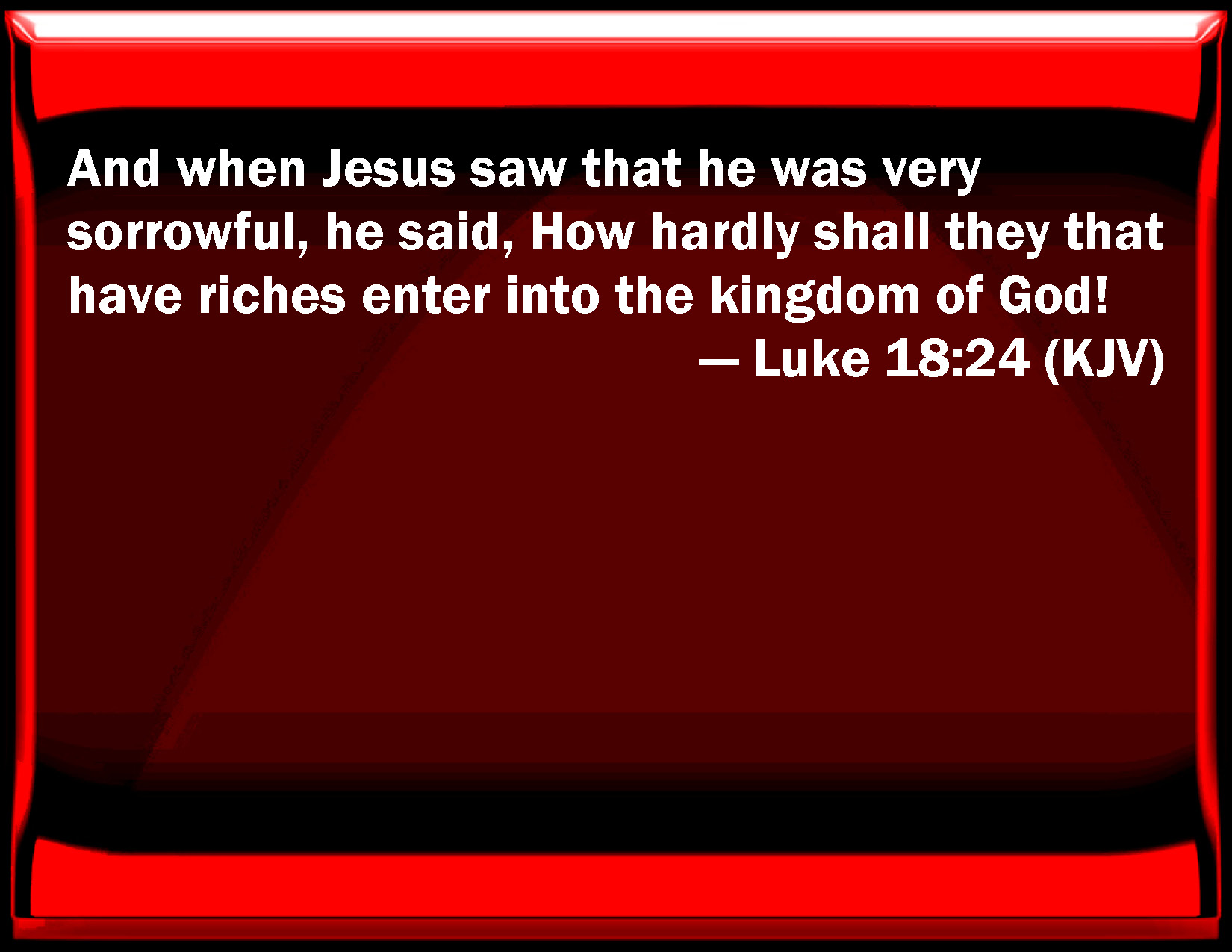 Bible Verse Slide Luke 18:24 And when Jesus saw that he was very sorrowful, he said, How hardly shall they that have riches enter into the kingdom of God! KJV: And when Jesus saw that he was very sorrowful, he said, How hardly shall they that have riches enter into the kingdom of God! DRB: And Jesus seeing him become sorrowful, said: How hardly shall they that have riches enter into the kingdom of God. DBT: But when Jesus saw that he became very sorrowful, he said, How difficultly shall those who have riches enter into the kingdom of God; ERV: And Jesus seeing him said, How hardly shall they that have riches enter into the kingdom of God! WBT: And when Jesus saw that he was very sorrowful, he said, How hardly will they that have riches enter into the kingdom of God! WEB: Jesus, seeing that he became very sad, said, "How hard it is for those who have riches to enter into the Kingdom of God! YLT: And Jesus having seen him become very sorrowful, said, 'How hardly shall those having riches enter into the reign of God!Links Luke 18:24 NIV • Luke 18:24 NLT • Luke 18:24 ESV • Luke 18:24 NASB • Luke 18:24 KJV • Luke 18:24 Interlinear • Luke 18:24 Commentaries • Luke 18:24 Parallel Texts • Luke 18:24 Bible Apps • Luke 18:24 Parallel • Bible Hub |