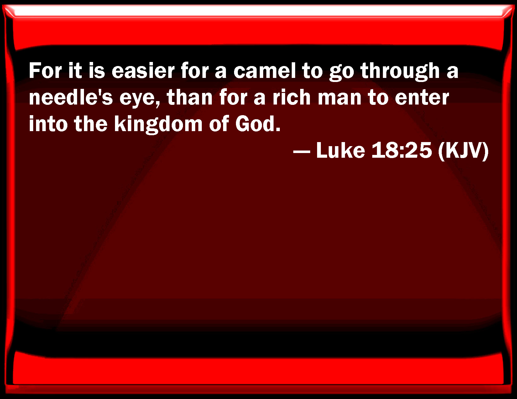 Luke 18:25 For it is easier for a camel to go through a needle's eye, than for a rich man to enter into the kingdom of God.