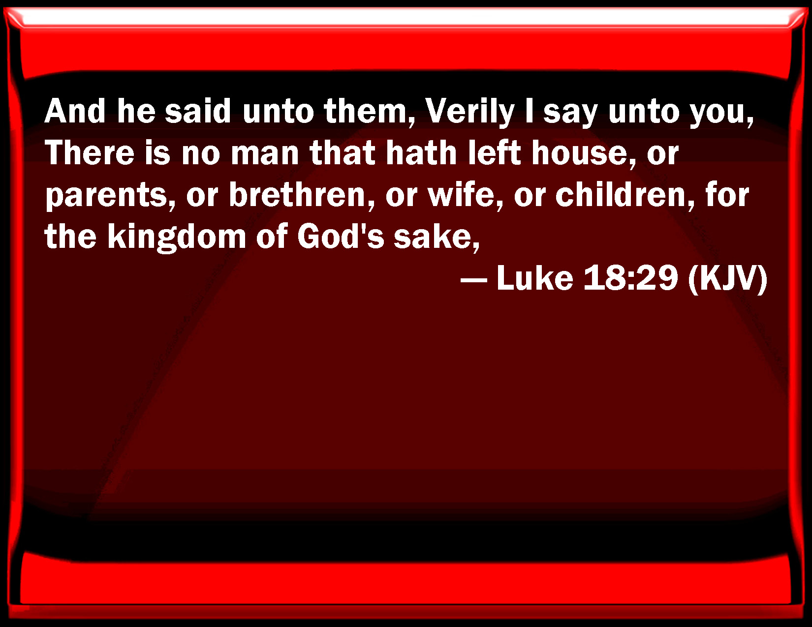 Bible Verse Slide Luke 18:29 And he said to them, Truly I say to you, There is no man that has left house, or parents, or brothers, or wife, or children, for the kingdom of God's sake, KJV: And he said unto them, Verily I say unto you, There is no man that hath left house, or parents, or brethren, or wife, or children, for the kingdom of God's sake, DRB: Who said to them: Amen, I say to you, there is no man that hath left house, or parents, or brethren, or wife, or children, for the kingdom of God's sake, DBT: And he said to them, Verily I say to you, There is no one who has left home, or parents, or brethren, or wife, or children, for the kingdom of God's sake, ERV: And he said unto them, Verily I say unto you, There is no man that hath left house, or wife, or brethren, or parents, or children, for the kingdom of God's sake, WBT: And he said to them, Verily I say to you, there is no man that hath left house, or parents, or brethren, or wife, or children for the sake of the kingdom of God, WEB: He said to them, "Most certainly I tell you, there is no one who has left house, or wife, or brothers, or parents, or children, for the Kingdom of God's sake, YLT: and he said to them, 'Verily I say to you, that there is not one who left house, or parents, or brothers, or wife, or children, for the sake of the reign of God,Links Luke 18:29 NIV • Luke 18:29 NLT • Luke 18:29 ESV • Luke 18:29 NASB • Luke 18:29 KJV • Luke 18:29 Interlinear • Luke 18:29 Commentaries • Luke 18:29 Parallel Texts • Luke 18:29 Bible Apps • Luke 18:29 Parallel • Bible Hub |