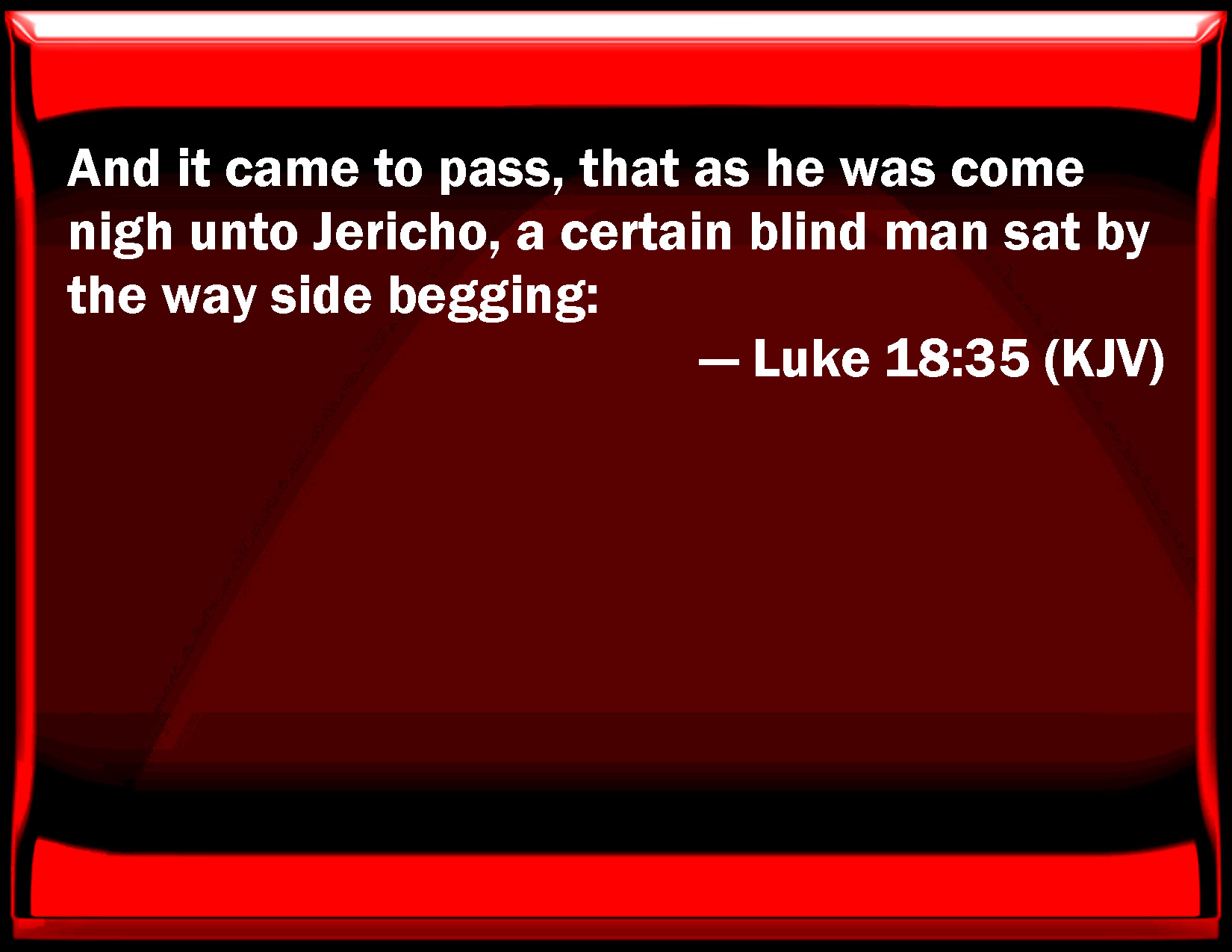 Bible Verse Slide Luke 18:35 And it came to pass, that as he was come near to Jericho, a certain blind man sat by the way side begging: KJV: And it came to pass, that as he was come nigh unto Jericho, a certain blind man sat by the way side begging: DRB: Now it came to pass, when he drew nigh to Jericho, that a certain blind man sat by the way side, begging. DBT: And it came to pass when he came into the neighbourhood of Jericho, a certain blind man sat by the wayside begging. ERV: And it came to pass, as he drew nigh unto Jericho, a certain blind man sat by the way side begging: WBT: And it came to pass, that as he had come nigh to Jericho, a certain blind man sat by the way side begging; WEB: It happened, as he came near Jericho, a certain blind man sat by the road, begging. YLT: And it came to pass, in his coming nigh to Jericho, a certain blind man was sitting beside the way begging,Links Luke 18:35 NIV • Luke 18:35 NLT • Luke 18:35 ESV • Luke 18:35 NASB • Luke 18:35 KJV • Luke 18:35 Interlinear • Luke 18:35 Commentaries • Luke 18:35 Parallel Texts • Luke 18:35 Bible Apps • Luke 18:35 Parallel • Bible Hub |