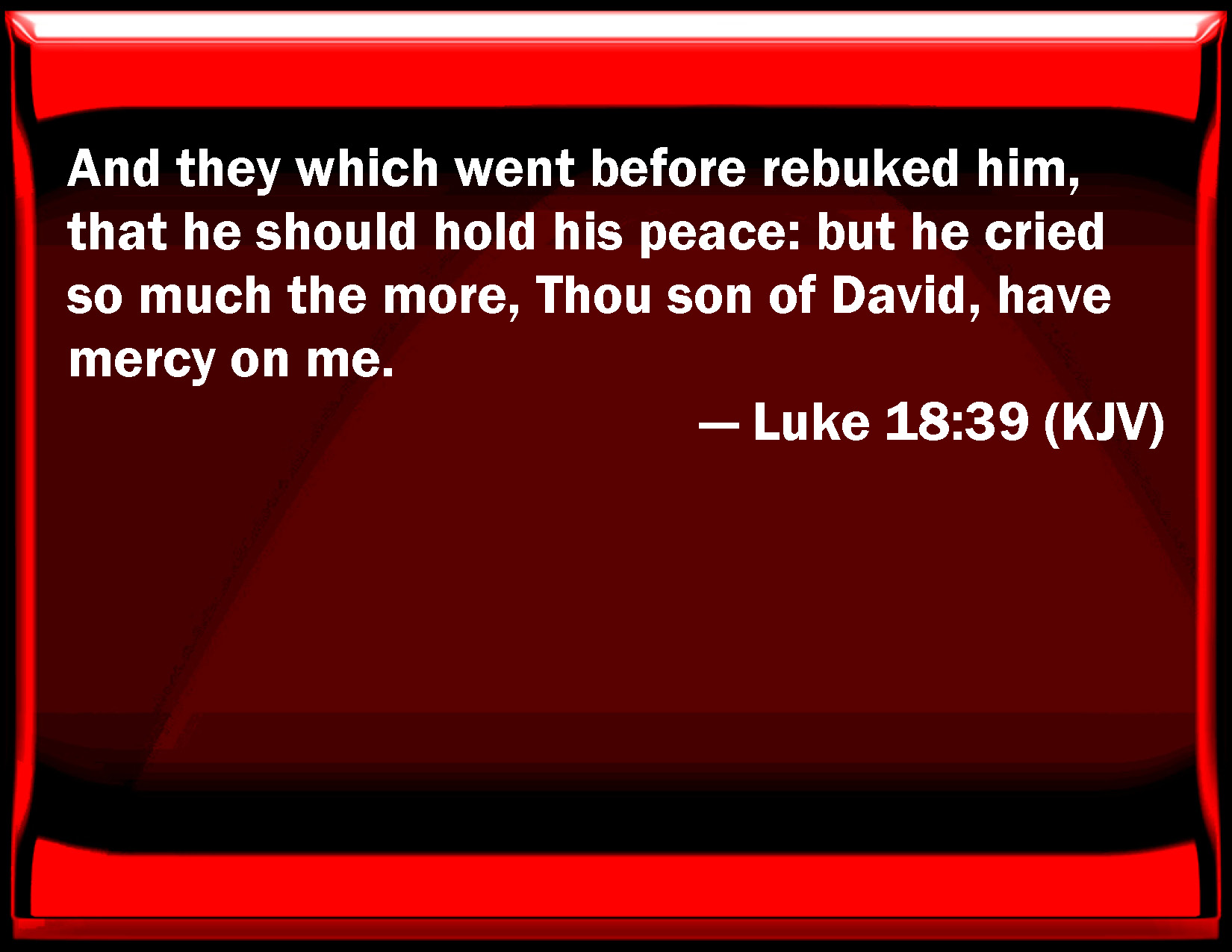 Bible Verse Slide Luke 18:39 And they which went before rebuked him, that he should hold his peace: but he cried so much the more, You son of David, have mercy on me. KJV: And they which went before rebuked him, that he should hold his peace: but he cried so much the more, Thou Son of David, have mercy on me. DRB: And they that went before, rebuked him, that he should hold his peace: but he cried out much more: Son of David, have mercy on me. DBT: And those who were going before rebuked him that he might be silent; but he cried out so much the more, Son of David, have mercy on me. ERV: And they that went before rebuked him, that he should hold his peace: but he cried out the more a great deal, Thou son of David, have mercy on me. WBT: And they who went before rebuked him, that he should hold his peace: but he cried so much the more, Thou son of David, have mercy on me. WEB: Those who led the way rebuked him, that he should be quiet; but he cried out all the more, "You son of David, have mercy on me!" YLT: and those going before were rebuking him, that he might be silent, but he was much more crying out, 'Son of David, deal kindly with me.'Links Luke 18:39 NIV • Luke 18:39 NLT • Luke 18:39 ESV • Luke 18:39 NASB • Luke 18:39 KJV • Luke 18:39 Interlinear • Luke 18:39 Commentaries • Luke 18:39 Parallel Texts • Luke 18:39 Bible Apps • Luke 18:39 Parallel • Bible Hub |