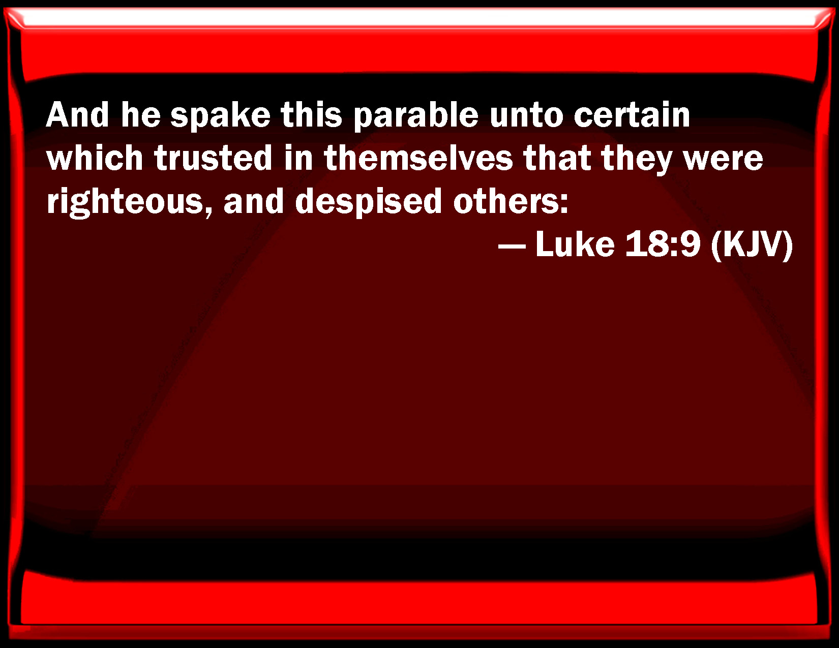 Bible Verse Slide Luke 18:9 And he spoke this parable to certain which trusted in themselves that they were righteous, and despised others: KJV: And he spake this parable unto certain which trusted in themselves that they were righteous, and despised others: DRB: And to some who trusted in themselves as just, and despised others, he spoke also this parable: DBT: And he spoke also to some, who trusted in themselves that they were righteous and made nothing of all the rest of men, this parable: ERV: And he spake also this parable unto certain which trusted in themselves that they were righteous, and set all others at nought: WBT: And he spoke this parable to certain who trusted in themselves that they were righteous, and despised others: WEB: He spoke also this parable to certain people who were convinced of their own righteousness, and who despised all others. YLT: And he spake also unto certain who have been trusting in themselves that they were righteous, and have been despising the rest, this simile:Links Luke 18:9 NIV • Luke 18:9 NLT • Luke 18:9 ESV • Luke 18:9 NASB • Luke 18:9 KJV • Luke 18:9 Interlinear • Luke 18:9 Commentaries • Luke 18:9 Parallel Texts • Luke 18:9 Bible Apps • Luke 18:9 Parallel • Bible Hub |