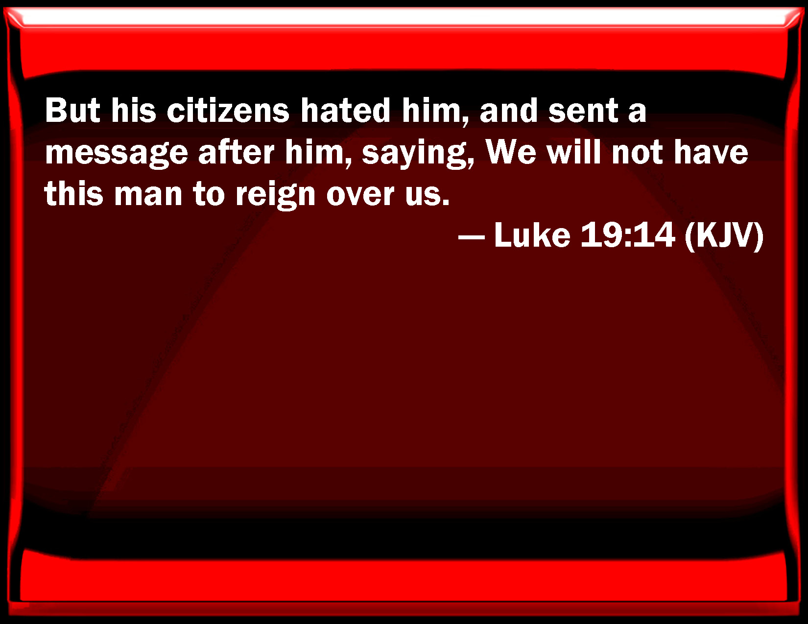 Bible Verse Slide Luke 19:14 But his citizens hated him, and sent a message after him, saying, We will not have this man to reign over us. KJV: But his citizens hated him, and sent a message after him, saying, We will not have this man to reign over us. DRB: But his citizens hated him: and they sent an embassage after him, saying: We will not have this man to reign over us. DBT: But his citizens hated him, and sent an embassy after him, saying, We will not that this man should reign over us. ERV: But his citizens hated him, and sent an ambassage after him, saying, We will not that this man reign over us. WBT: But his citizens hated him, and sent a message after him, saying, We will not have this man to reign over us. WEB: But his citizens hated him, and sent an envoy after him, saying, 'We don't want this man to reign over us.' YLT: and his citizens were hating him, and did send an embassy after him, saying, We do not wish this one to reign over us.Links Luke 19:14 NIV • Luke 19:14 NLT • Luke 19:14 ESV • Luke 19:14 NASB • Luke 19:14 KJV • Luke 19:14 Interlinear • Luke 19:14 Commentaries • Luke 19:14 Parallel Texts • Luke 19:14 Bible Apps • Luke 19:14 Parallel • Bible Hub |