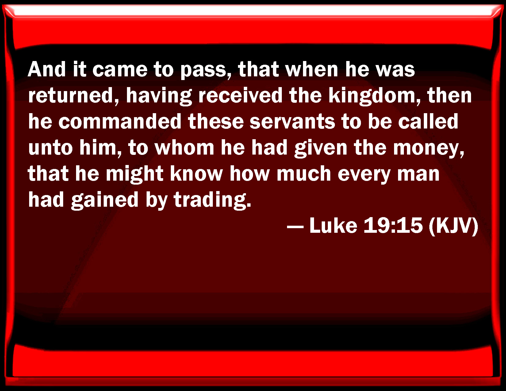 Bible Verse Slide Luke 19:15 And it came to pass, that when he was returned, having received the kingdom, then he commanded these servants to be called to him, to whom he had given the money, that he might know how much every man had gained by trading. KJV: And it came to pass, that when he was returned, having received the kingdom, then he commanded these servants to be called unto him, to whom he had given the money, that he might know how much every man had gained by trading. DRB: And it came to pass, that he returned, having received the kingdom: and he commanded his servants to be called, to whom he had given the money, that he might know how much every man had gained by trading. DBT: And it came to pass on his arrival back again, having received the kingdom, that he desired these bondmen to whom he gave the money to be called to him, in order that he might know what every one had gained by trading. ERV: And it came to pass, when he was come back again, having received the kingdom, that he commanded these servants, unto whom he had given the money, to be called to him, that he might know what they had gained by trading. WBT: And it came to pass, that when he had returned, having received the kingdom, then he commanded these servants to be called to him, to whom he had given the money, that he might know how much every man had gained by trading. WEB: "It happened when he had come back again, having received the kingdom, that he commanded these servants, to whom he had given the money, to be called to him, that he might know what they had gained by conducting business. YLT: 'And it came to pass, on his coming back, having taken the kingdom, that he commanded these servants to be called to him, to whom he gave the money, that he might know what any one had done in business.Links Luke 19:15 NIV • Luke 19:15 NLT • Luke 19:15 ESV • Luke 19:15 NASB • Luke 19:15 KJV • Luke 19:15 Interlinear • Luke 19:15 Commentaries • Luke 19:15 Parallel Texts • Luke 19:15 Bible Apps • Luke 19:15 Parallel • Bible Hub |