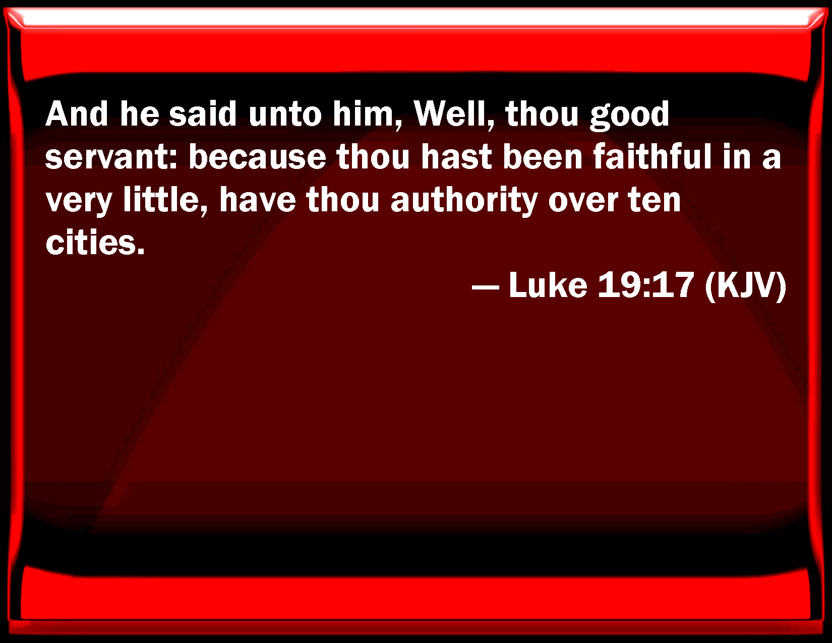 Bible Verse Slide Luke 19:17 And he said to him, Well, you good servant: because you have been faithful in a very little, have you authority over ten cities. KJV: And he said unto him, Well, thou good servant: because thou hast been faithful in a very little, have thou authority over ten cities. DRB: And he said to him: Well done, thou good servant, because thou hast been faithful in a little, thou shalt have power over ten cities. DBT: And he said to him, Well done, thou good bondman; because thou hast been faithful in that which is least, be thou in authority over ten cities. ERV: And he said unto him, Well done, thou good servant: because thou wast found faithful in a very little, have thou authority over ten cities. WBT: And he said to him, Well, thou good servant: because thou hast been faithful in a very little, have thou authority over ten cities. WEB: "He said to him, 'Well done, you good servant! Because you were found faithful with very little, you shall have authority over ten cities.' YLT: and he said to him, Well done, good servant, because in a very little thou didst become faithful, be having authority over ten cities.Links Luke 19:17 NIV • Luke 19:17 NLT • Luke 19:17 ESV • Luke 19:17 NASB • Luke 19:17 KJV • Luke 19:17 Interlinear • Luke 19:17 Commentaries • Luke 19:17 Parallel Texts • Luke 19:17 Bible Apps • Luke 19:17 Parallel • Bible Hub |