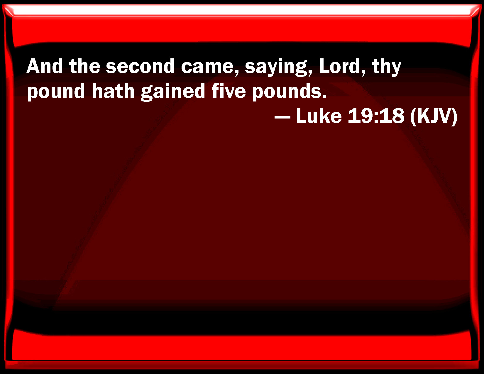 Bible Verse Slide Luke 19:18 And the second came, saying, Lord, your pound has gained five pounds. KJV: And the second came, saying, Lord, thy pound hath gained five pounds. DRB: And the second came, saying: Lord, thy pound hath gained five pounds. DBT: And the second came, saying, My Lord, thy mina has made five minas. ERV: And the second came, saying, Thy pound, Lord, hath made five pounds. WBT: And the second came, saying, Lord, thy pound hath gained five pounds. WEB: "The second came, saying, 'Your mina, Lord, has made five minas.' YLT: 'And the second came, saying, Sir, thy pound made five pounds;Links Luke 19:18 NIV • Luke 19:18 NLT • Luke 19:18 ESV • Luke 19:18 NASB • Luke 19:18 KJV • Luke 19:18 Interlinear • Luke 19:18 Commentaries • Luke 19:18 Parallel Texts • Luke 19:18 Bible Apps • Luke 19:18 Parallel • Bible Hub |