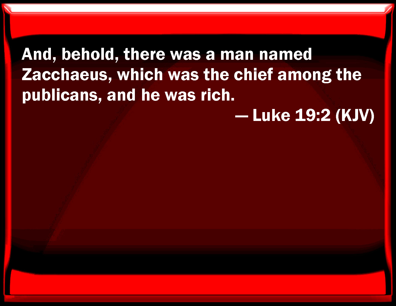 Bible Verse Slide Luke 19:2 And, behold, there was a man named Zacchaeus, which was the chief among the publicans, and he was rich. KJV: And, behold, there was a man named Zacchaeus, which was the chief among the publicans, and he was rich. DRB: And behold, there was a man named Zacheus, who was the chief of the publicans, and he was rich. DBT: And behold, there was a man by name called Zacchaeus, and he was chief tax-gatherer, and he was rich. ERV: And behold, a man called by name Zacchaeus; and he was a chief publican, and he was rich. WBT: And behold, there was a man named Zaccheus, who was the chief among the publicans, and he was rich. WEB: There was a man named Zacchaeus. He was a chief tax collector, and he was rich. YLT: and lo, a man, by name called Zaccheus, and he was a chief tax-gatherer, and he was rich,Links Luke 19:2 NIV • Luke 19:2 NLT • Luke 19:2 ESV • Luke 19:2 NASB • Luke 19:2 KJV • Luke 19:2 Interlinear • Luke 19:2 Commentaries • Luke 19:2 Parallel Texts • Luke 19:2 Bible Apps • Luke 19:2 Parallel • Bible Hub |