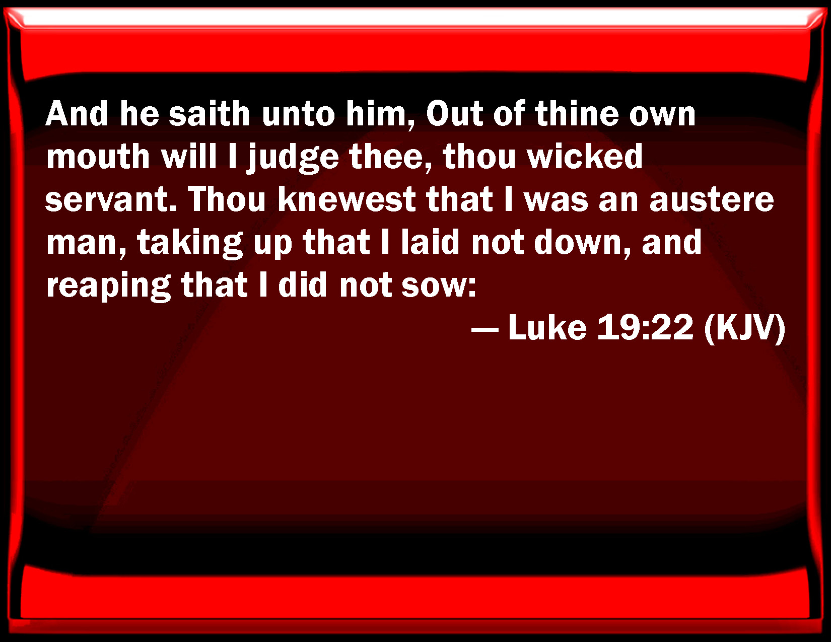 Bible Verse Slide Luke 19:22 And he said to him, Out of your own mouth will I judge you, you wicked servant. You knew that I was an austere man, taking up that I laid not down, and reaping that I did not sow: KJV: And he saith unto him, Out of thine own mouth will I judge thee, thou wicked servant. Thou knewest that I was an austere man, taking up that I laid not down, and reaping that I did not sow: DRB: He saith to him: Out of thy own mouth I judge thee, thou wicked servant. Thou knewest that I was an austere man, taking up what I laid not down, and reaping that which I did not sow: DBT: He says to him, Out of thy mouth will I judge thee, wicked bondman: thou knewest that I am a harsh man, taking up what I have not laid down and reaping what I have not sowed. ERV: He saith unto him, Out of thine own mouth will I judge thee, thou wicked servant. Thou knewest that I am an austere man, taking up that I laid not down, and reaping that I did not sow; WBT: And he saith to him, Out of thy own mouth will I judge thee, thou wicked servant. Thou knewest me to be an austere man, taking up what I laid not down, and reaping what I did not sow: WEB: "He said to him, 'Out of your own mouth will I judge you, you wicked servant! You knew that I am an exacting man, taking up that which I didn't lay down, and reaping that which I didn't sow. YLT: 'And he saith to him, Out of thy mouth I will judge thee, evil servant: thou knewest that I am an austere man, taking up what I did not lay down, and reaping what I did not sow!Links Luke 19:22 NIV • Luke 19:22 NLT • Luke 19:22 ESV • Luke 19:22 NASB • Luke 19:22 KJV • Luke 19:22 Interlinear • Luke 19:22 Commentaries • Luke 19:22 Parallel Texts • Luke 19:22 Bible Apps • Luke 19:22 Parallel • Bible Hub |