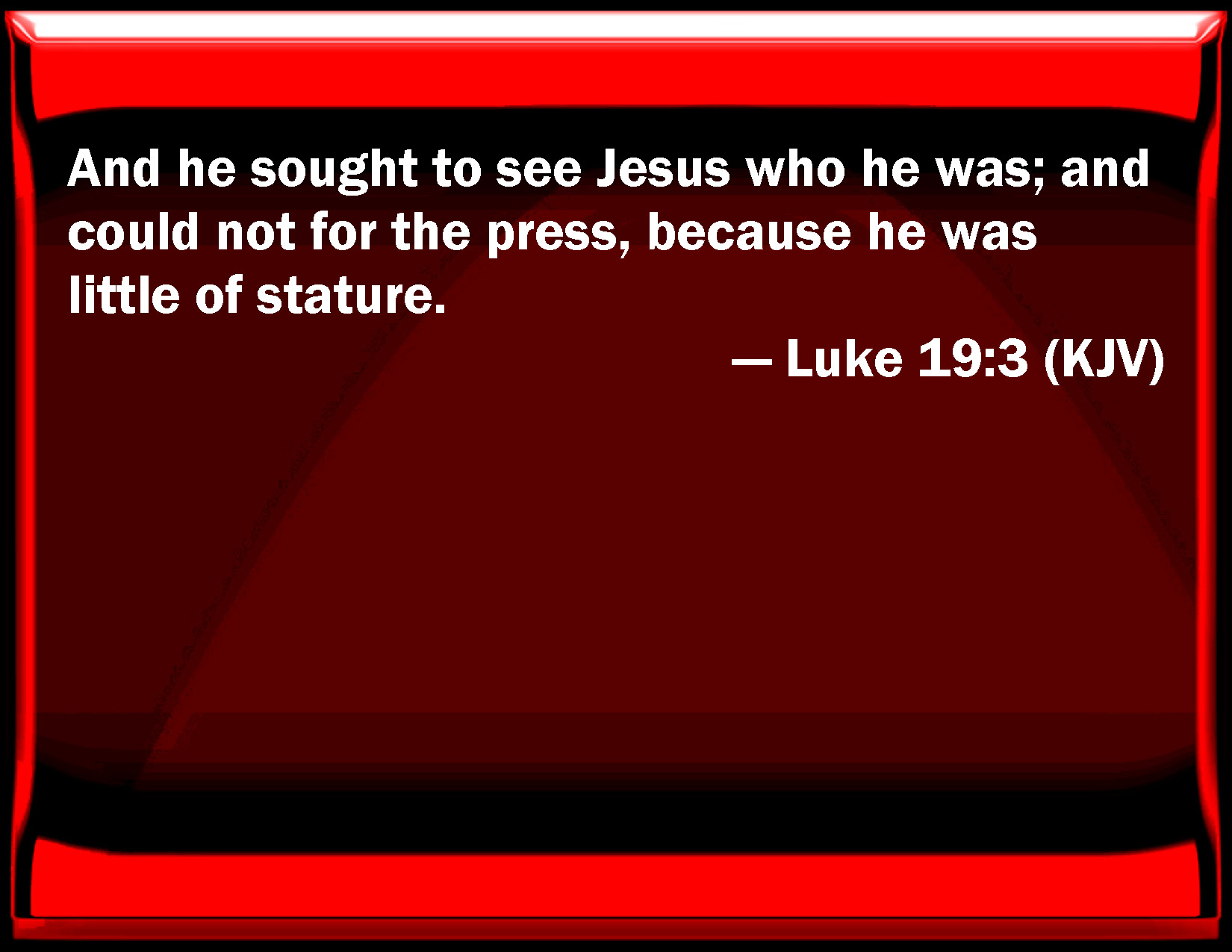 Bible Verse Slide Luke 19:3 And he sought to see Jesus who he was; and could not for the press, because he was little of stature. KJV: And he sought to see Jesus who he was; and could not for the press, because he was little of stature. DRB: And he sought to see Jesus who he was, and he could not for the crowd, because he was low of stature. DBT: And he sought to see Jesus who he was: and he could not for the crowd, because he was little in stature. ERV: And he sought to see Jesus who he was; and could not for the crowd, because he was little of stature. WBT: And he sought to see Jesus who he was; and could not for the crowd, because he was little of stature. WEB: He was trying to see who Jesus was, and couldn't because of the crowd, because he was short. YLT: and he was seeking to see Jesus, who he is, and was not able for the multitude, because in stature he was small,Links Luke 19:3 NIV • Luke 19:3 NLT • Luke 19:3 ESV • Luke 19:3 NASB • Luke 19:3 KJV • Luke 19:3 Interlinear • Luke 19:3 Commentaries • Luke 19:3 Parallel Texts • Luke 19:3 Bible Apps • Luke 19:3 Parallel • Bible Hub |
