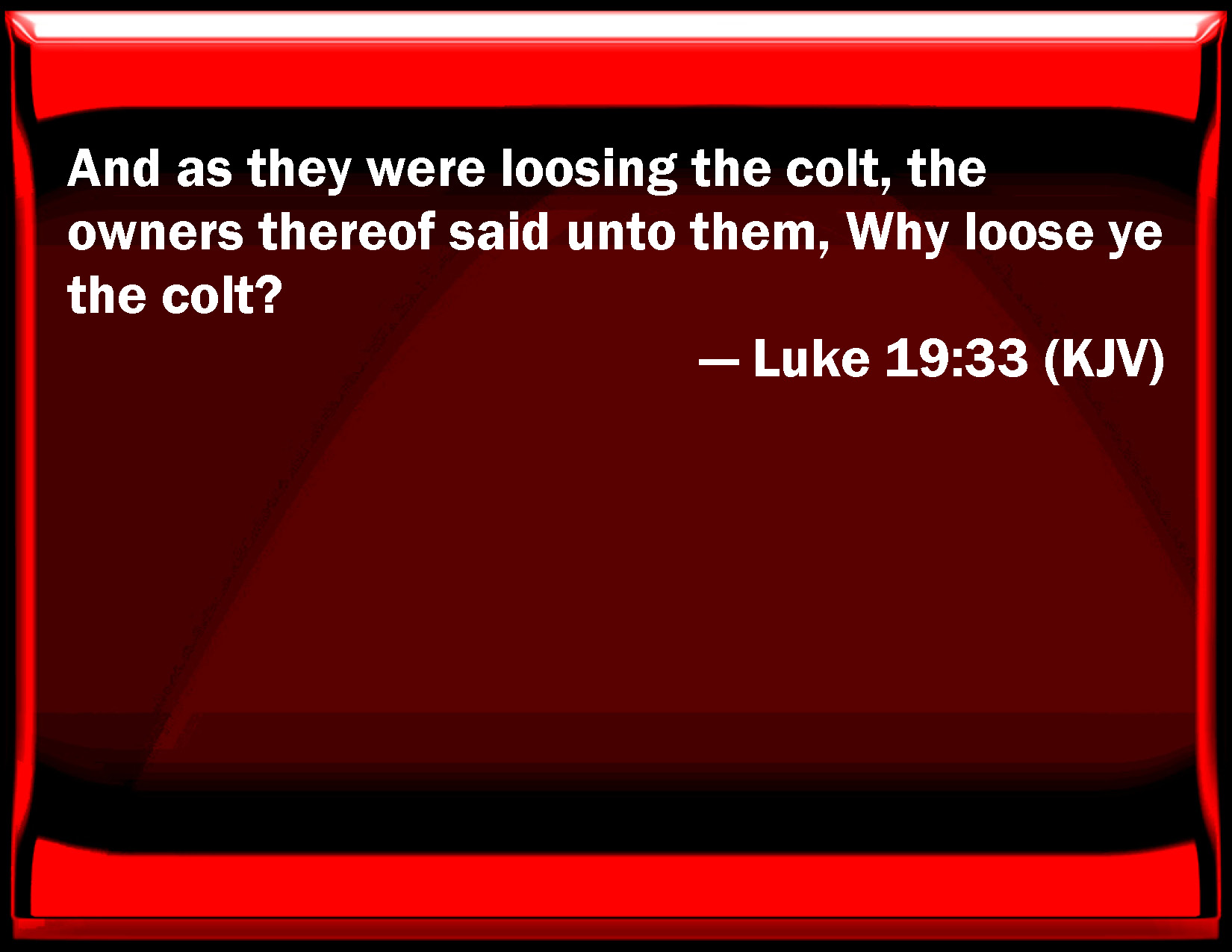 Bible Verse Slide Luke 19:33 And as they were loosing the colt, the owners thereof said to them, Why loose you the colt? KJV: And as they were loosing the colt, the owners thereof said unto them, Why loose ye the colt? DRB: And as they were loosing the colt, the owners thereof said to them: Why loose you the colt? DBT: And as they were loosing the colt, its masters said to them, Why loose ye the colt? ERV: And as they were loosing the colt, the owners thereof said unto them, Why loose ye the colt? WBT: And as they were loosing the colt, the owners of it said to them, Why loose ye the colt? WEB: As they were untying the colt, its owners said to them, "Why are you untying the colt?" YLT: and while they are loosing the colt, its owners said unto them, 'Why loose ye the colt?'Links Luke 19:33 NIV • Luke 19:33 NLT • Luke 19:33 ESV • Luke 19:33 NASB • Luke 19:33 KJV • Luke 19:33 Interlinear • Luke 19:33 Commentaries • Luke 19:33 Parallel Texts • Luke 19:33 Bible Apps • Luke 19:33 Parallel • Bible Hub |