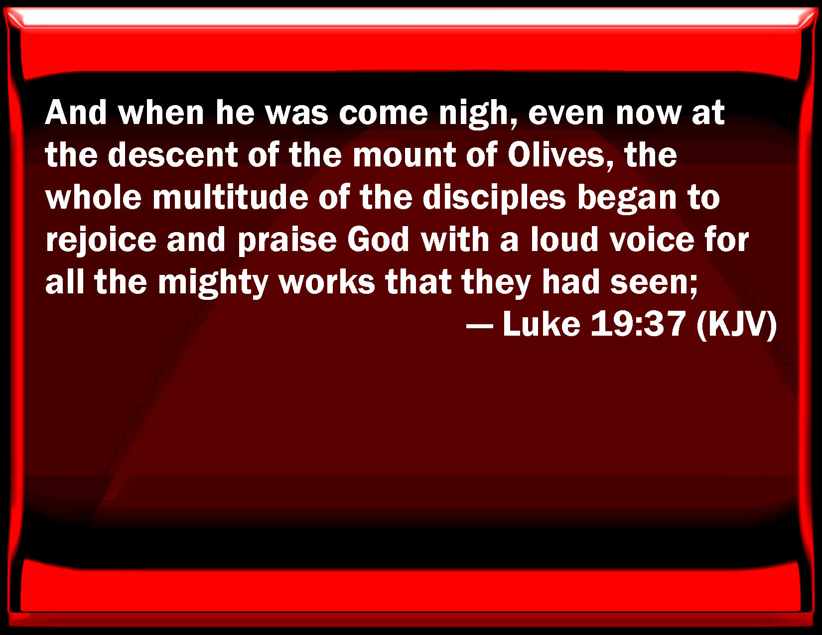 Bible Verse Slide Luke 19:37 And when he was come near, even now at the descent of the mount of Olives, the whole multitude of the disciples began to rejoice and praise God with a loud voice for all the mighty works that they had seen; KJV: And when he was come nigh, even now at the descent of the mount of Olives, the whole multitude of the disciples began to rejoice and praise God with a loud voice for all the mighty works that they had seen; DRB: And when he was now coming near the descent of mount Olivet, the whole multitude of his disciples began with joy to praise God with a loud voice, for all the mighty works they had seen, DBT: And as he drew near, already at the descent of the mount of Olives, all the multitude of the disciples began, rejoicing, to praise God with a loud voice for all the works of power which they had seen, ERV: And as he was now drawing nigh, even at the descent of the mount of Olives, the whole multitude of the disciples began to rejoice and praise God with a loud voice for all the mighty works which they had seen; WBT: And when he had come nigh, even now at the descent of the mount of Olives, the whole multitude of the disciples began to rejoice and praise God with a loud voice, for all the mighty works that they had seen. WEB: As he was now getting near, at the descent of the Mount of Olives, the whole multitude of the disciples began to rejoice and praise God with a loud voice for all the mighty works which they had seen, YLT: and as he is coming nigh now, at the descent of the mount of the Olives, the whole multitude of the disciples began rejoicing to praise God with a great voice for all the mighty works they had seen,Links Luke 19:37 NIV • Luke 19:37 NLT • Luke 19:37 ESV • Luke 19:37 NASB • Luke 19:37 KJV • Luke 19:37 Interlinear • Luke 19:37 Commentaries • Luke 19:37 Parallel Texts • Luke 19:37 Bible Apps • Luke 19:37 Parallel • Bible Hub |