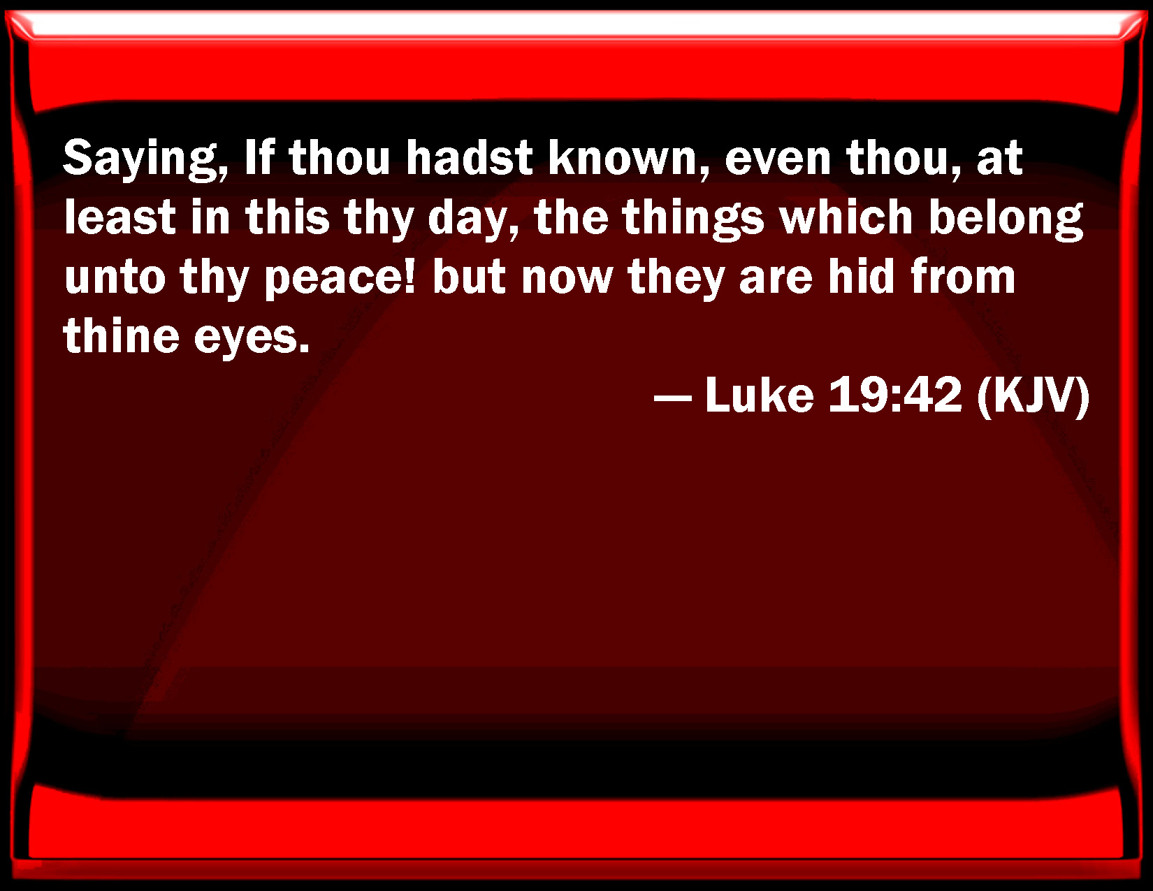 Bible Verse Slide Luke 19:42 Saying, If you had known, even you, at least in this your day, the things which belong to your peace! but now they are hid from your eyes. KJV: Saying, If thou hadst known, even thou, at least in this thy day, the things which belong unto thy peace! but now they are hid from thine eyes. DRB: If thou also hadst known, and that in this thy day, the things that are to thy peace; but now they are hidden from thy eyes. DBT: saying, If thou hadst known, even thou, even at least in this thy day, the things that are for thy peace: but now they are hid from thine eyes; ERV: saying, If thou hadst known in this day, even thou, the things which belong unto peace! but now they are hid from thine eyes. WBT: Saying, If thou hadst known, even thou, at least in this thy day, the things which belong to thy peace! but now they are hid from thy eyes. WEB: saying, "If you, even you, had known today the things which belong to your peace! But now, they are hidden from your eyes. YLT: saying — 'If thou didst know, even thou, at least in this thy day, the things for thy peace; but now they were hid from thine eyes.Links Luke 19:42 NIV • Luke 19:42 NLT • Luke 19:42 ESV • Luke 19:42 NASB • Luke 19:42 KJV • Luke 19:42 Interlinear • Luke 19:42 Commentaries • Luke 19:42 Parallel Texts • Luke 19:42 Bible Apps • Luke 19:42 Parallel • Bible Hub |