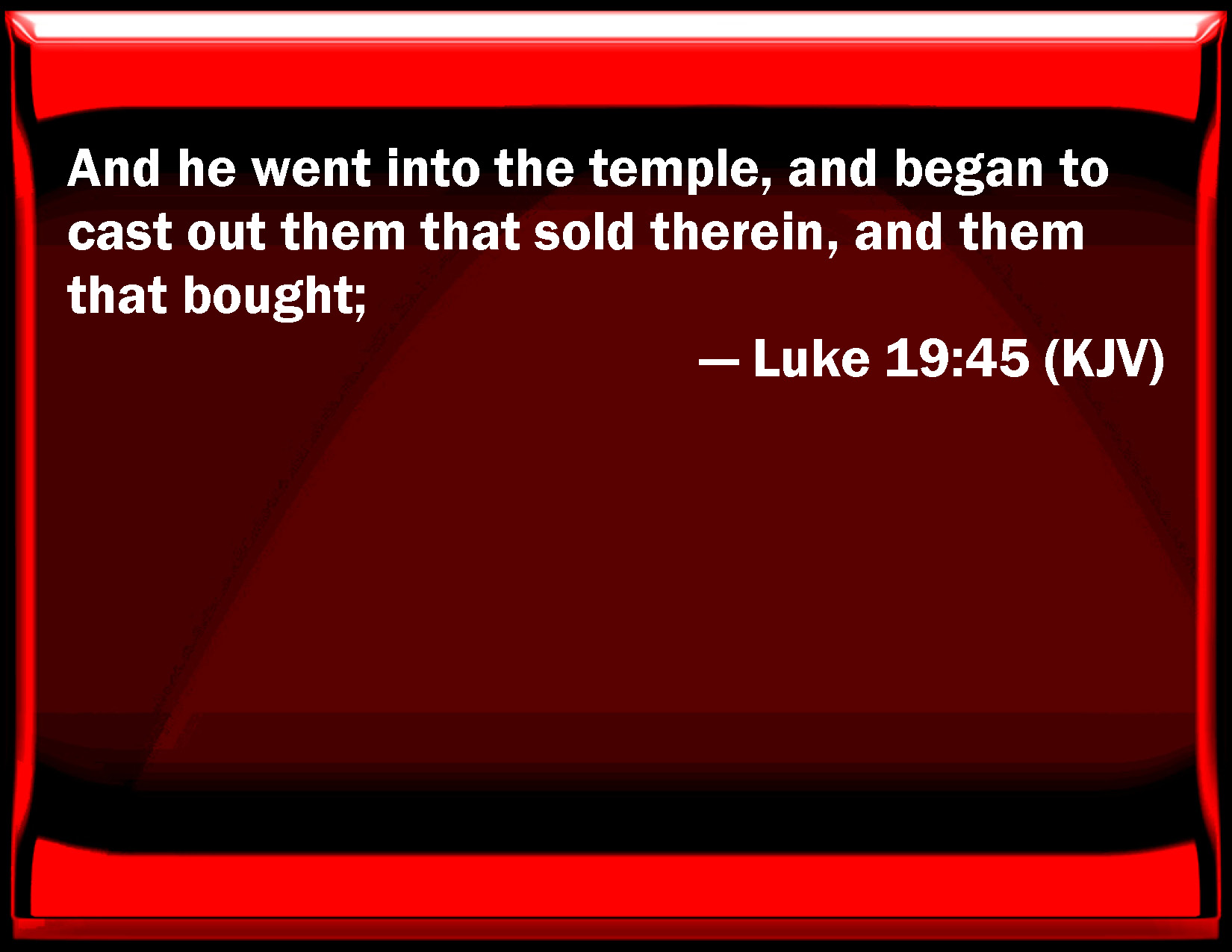 Bible Verse Slide Luke 19:45 And he went into the temple, and began to cast out them that sold therein, and them that bought; KJV: And he went into the temple, and began to cast out them that sold therein, and them that bought; DRB: And entering into the temple, he began to cast out them that sold therein, and them that bought. DBT: And entering into the temple, he began to cast out those that sold and bought in it, ERV: And he entered into the temple, and began to cast out them that sold, WBT: And he went into the temple, and began to cast out them that sold in it, and them that bought, WEB: He entered into the temple, and began to drive out those who bought and sold in it, YLT: And having entered into the temple, he began to cast forth those selling in it, and those buying,Links Luke 19:45 NIV • Luke 19:45 NLT • Luke 19:45 ESV • Luke 19:45 NASB • Luke 19:45 KJV • Luke 19:45 Interlinear • Luke 19:45 Commentaries • Luke 19:45 Parallel Texts • Luke 19:45 Bible Apps • Luke 19:45 Parallel • Bible Hub |