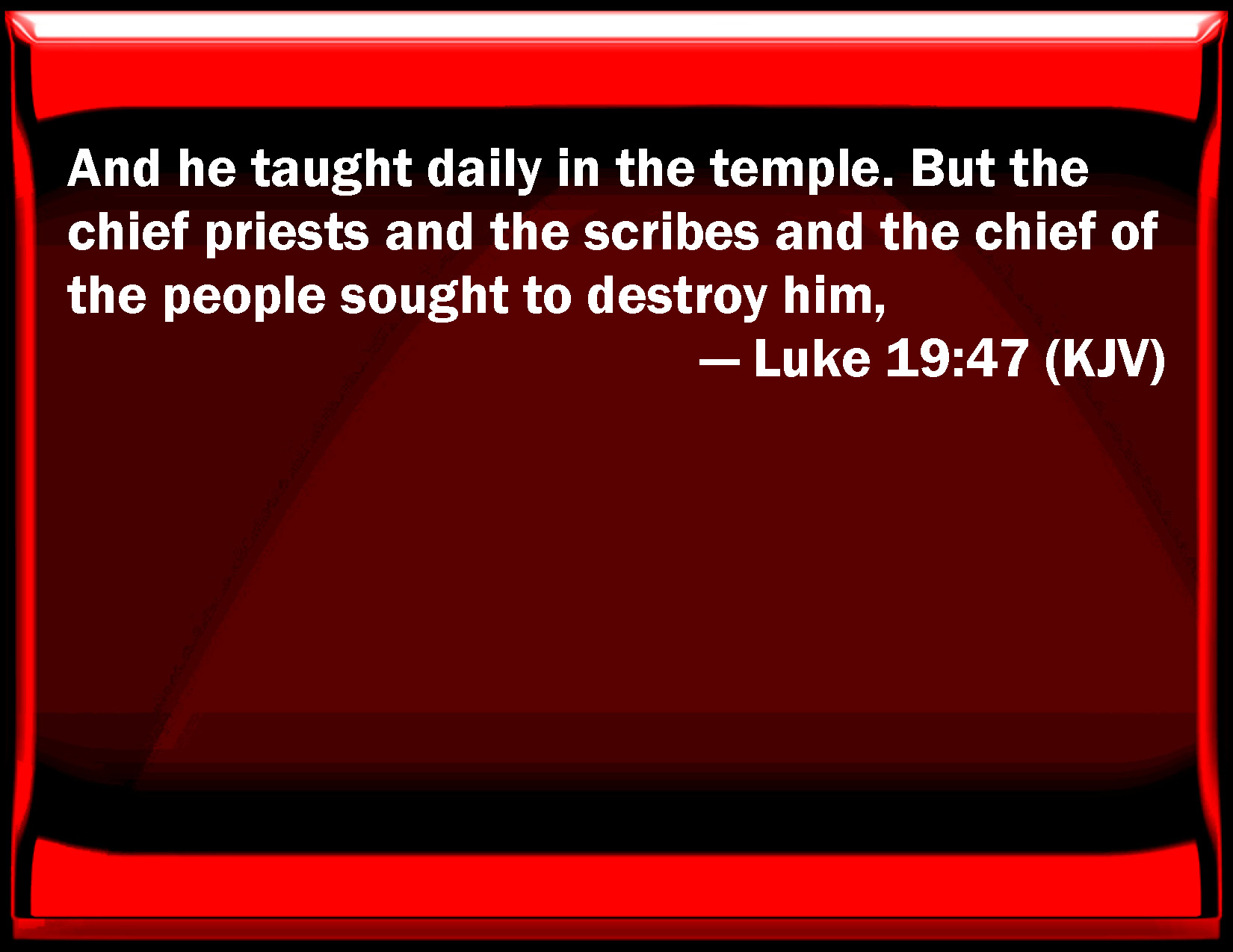 Luke 19:47 And he taught daily in the temple. But the chief priests and the scribes and the chief of the people sought to destroy him,