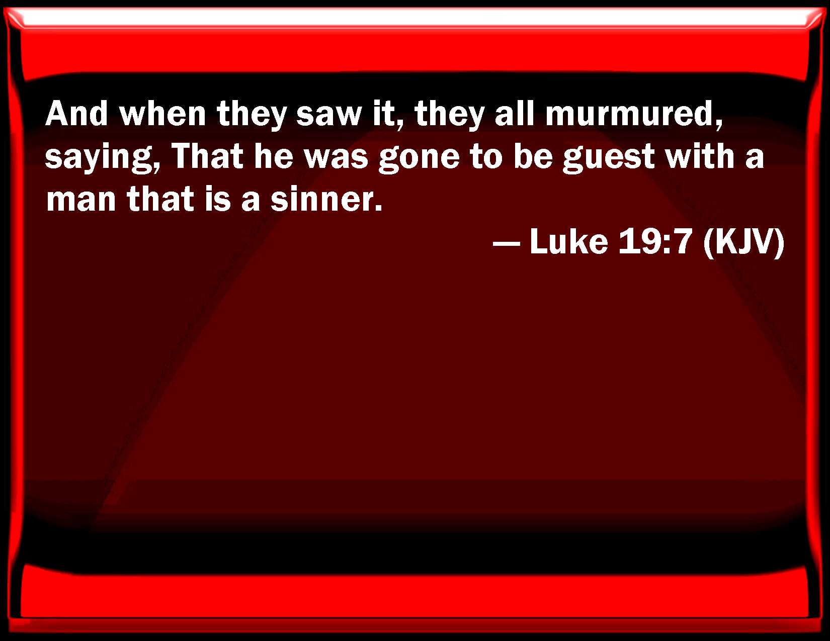 Bible Verse Slide Luke 19:7 And when they saw it, they all murmured, saying, That he was gone to be guest with a man that is a sinner. KJV: And when they saw it, they all murmured, saying, That he was gone to be guest with a man that is a sinner. DRB: And when all saw it, they murmured, saying, that he was gone to be a guest with a man that was a sinner. DBT: And all murmured when they saw it, saying, He has turned in to lodge with a sinful man. ERV: And when they saw it, they all murmured, saying, He is gone in to lodge with a man that is a sinner. WBT: And when they saw it, they all murmured, saying, That he was gone to be guest with a man that is a sinner. WEB: When they saw it, they all murmured, saying, "He has gone in to lodge with a man who is a sinner." YLT: and having seen it, they were all murmuring, saying — 'With a sinful man he went in to lodge!'Links Luke 19:7 NIV • Luke 19:7 NLT • Luke 19:7 ESV • Luke 19:7 NASB • Luke 19:7 KJV • Luke 19:7 Interlinear • Luke 19:7 Commentaries • Luke 19:7 Parallel Texts • Luke 19:7 Bible Apps • Luke 19:7 Parallel • Bible Hub |
