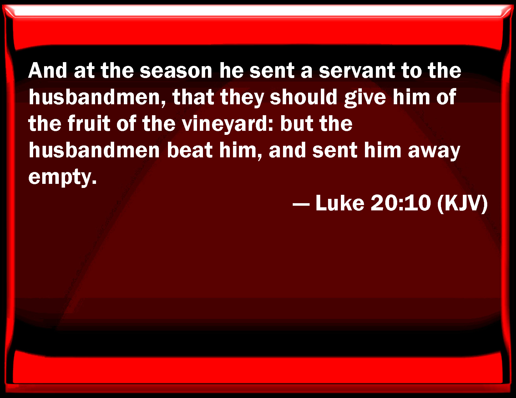 Bible Verse Slide Luke 20:10 And at the season he sent a servant to the farmers, that they should give him of the fruit of the vineyard: but the farmers beat him, and sent him away empty. KJV: And at the season he sent a servant to the husbandmen, that they should give him of the fruit of the vineyard: but the husbandmen beat him, and sent him away empty. DRB: And at the season he sent a servant to the husbandmen, that they should give him of the fruit of the vineyard. Who, beating him, sent him away empty. DBT: And in the season he sent to the husbandmen a bondman, that they might give to him of the fruit of the vineyard; but the husbandmen, having beaten him, sent him away empty. ERV: And at the season he sent unto the husbandmen a servant, that they should give him of the fruit of the vineyard: but the husbandmen beat him, and sent him away empty. WBT: And at the season he sent a servant to the husbandmen, that they should give him of the fruit of the vineyard: but the husbandmen beat him, and sent him away empty. WEB: At the proper season, he sent a servant to the farmers to collect his share of the fruit of the vineyard. But the farmers beat him, and sent him away empty. YLT: and at the season he sent unto the husbandmen a servant, that from the fruit of the vineyard they may give to him, but the husbandmen having beat him, did send him away empty.Links Luke 20:10 NIV • Luke 20:10 NLT • Luke 20:10 ESV • Luke 20:10 NASB • Luke 20:10 KJV • Luke 20:10 Interlinear • Luke 20:10 Commentaries • Luke 20:10 Parallel Texts • Luke 20:10 Bible Apps • Luke 20:10 Parallel • Bible Hub |