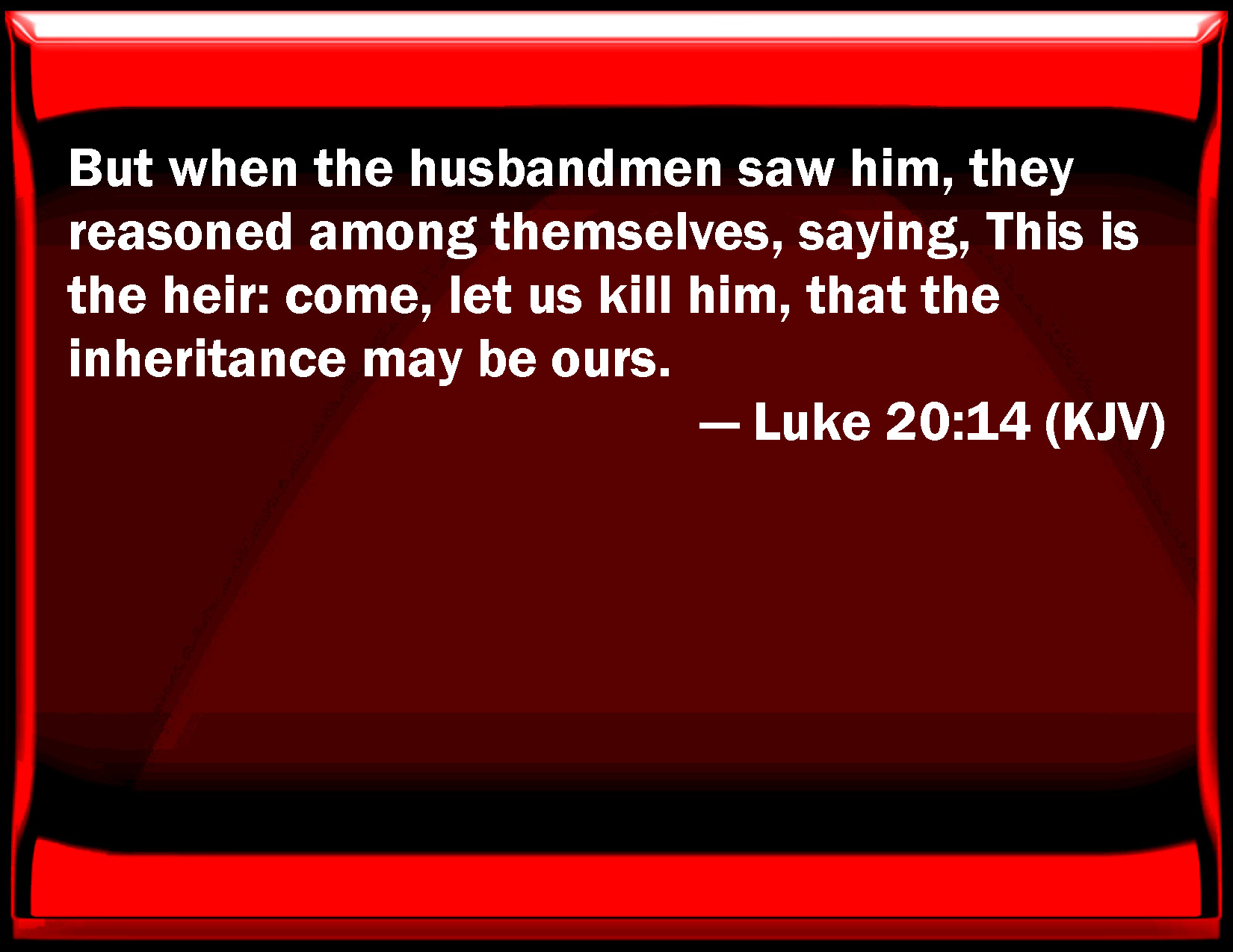 Bible Verse Slide Luke 20:14 But when the farmers saw him, they reasoned among themselves, saying, This is the heir: come, let us kill him, that the inheritance may be ours. KJV: But when the husbandmen saw him, they reasoned among themselves, saying, This is the heir: come, let us kill him, that the inheritance may be ours. DRB: Whom when the husbandmen saw, they thought within themselves, saying: This is the heir, let us kill him, that the inheritance may be ours. DBT: But when the husbandmen saw him, they reasoned among themselves, saying, This is the heir; come, let us kill him, that the inheritance may become ours. ERV: But when the husbandmen saw him, they reasoned one with another, saying, This is the heir: let us kill him, that the inheritance may be ours. WBT: But when the husbandmen saw him, they reasoned among themselves, saying, This is the heir; come, let us kill him, that the inheritance may be ours. WEB: "But when the farmers saw him, they reasoned among themselves, saying, 'This is the heir. Come, let's kill him, that the inheritance may be ours.' YLT: and having seen him, the husbandmen reasoned among themselves, saying, This is the heir; come, we may kill him, that the inheritance may become ours;Links Luke 20:14 NIV • Luke 20:14 NLT • Luke 20:14 ESV • Luke 20:14 NASB • Luke 20:14 KJV • Luke 20:14 Interlinear • Luke 20:14 Commentaries • Luke 20:14 Parallel Texts • Luke 20:14 Bible Apps • Luke 20:14 Parallel • Bible Hub |