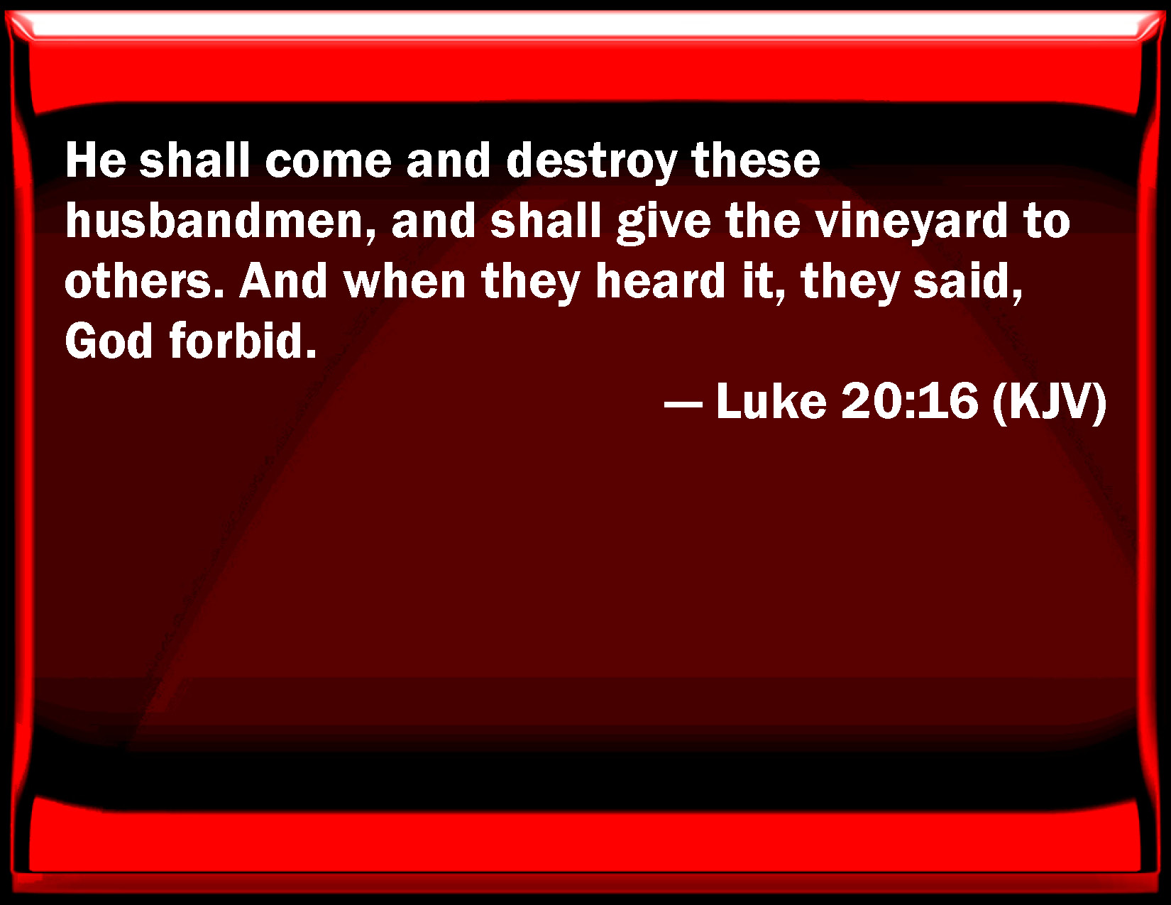 Bible Verse Slide Luke 20:16 He shall come and destroy these farmers, and shall give the vineyard to others. And when they heard it, they said, God forbid. KJV: He shall come and destroy these husbandmen, and shall give the vineyard to others. And when they heard it, they said, God forbid. DRB: He will come, and will destroy these husbandmen, and will give the vineyard to others. Which they hearing, said to him: God forbid. DBT: He will come and destroy those husbandmen, and will give the vineyard to others. And when they heard it they said, May it never be! ERV: He will come and destroy these husbandmen, and will give the vineyard unto others. And when they heard it, they said, God forbid. WBT: He will come and destroy these husbandmen, and will give the vineyard to others. And when they heard it, they said, may that never be. WEB: He will come and destroy these farmers, and will give the vineyard to others." When they heard it, they said, "May it never be!" YLT: He will come, and destroy these husbandmen, and will give the vineyard to others.' And having heard, they said, 'Let it not be!'Links Luke 20:16 NIV • Luke 20:16 NLT • Luke 20:16 ESV • Luke 20:16 NASB • Luke 20:16 KJV • Luke 20:16 Interlinear • Luke 20:16 Commentaries • Luke 20:16 Parallel Texts • Luke 20:16 Bible Apps • Luke 20:16 Parallel • Bible Hub |