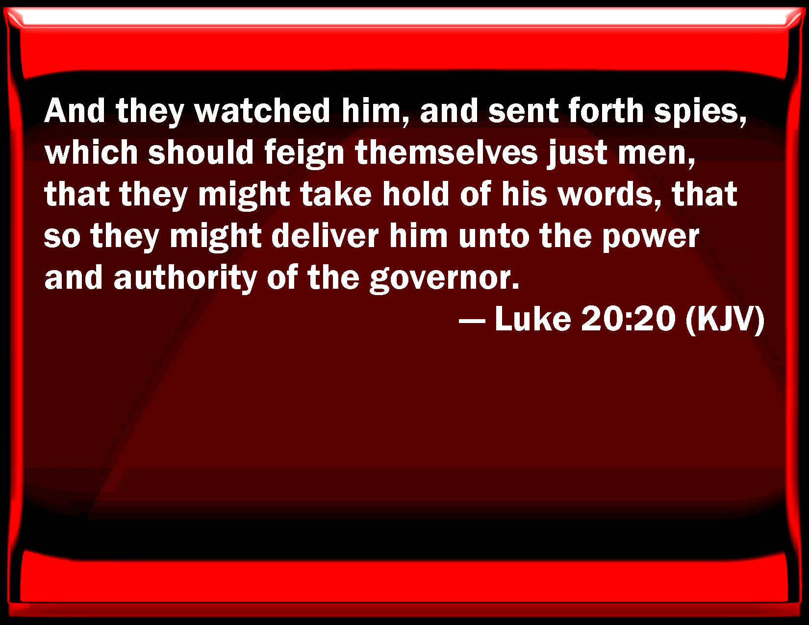 Bible Verse Slide Luke 20:20 And they watched him, and sent forth spies, which should feign themselves just men, that they might take hold of his words, that so they might deliver him to the power and authority of the governor. KJV: And they watched him, and sent forth spies, which should feign themselves just men, that they might take hold of his words, that so they might deliver him unto the power and authority of the governor. DRB: And being upon the watch, they sent spies, who should feign themselves just, that they might take hold of him in his words, that they might deliver him up to the authority and power of the governor. DBT: And having watched him, they sent out suborned persons, pretending to be just men, that they might take hold of him in his language, so that they might deliver him up to the power and authority of the governor. ERV: And they watched him, and sent forth spies, which feigned themselves to be righteous, that they might take hold of his speech, so as to deliver him up to the rule and to the authority of the governor. WBT: And they watched him, and sent forth spies, who should feign themselves just men, that they might take hold of his words, that so they might deliver him to the power and authority of the governor. WEB: They watched him, and sent out spies, who pretended to be righteous, that they might trap him in something he said, so as to deliver him up to the power and authority of the governor. YLT: And, having watched him, they sent forth liers in wait, feigning themselves to be righteous, that they might take hold of his word, to deliver him up to the rule and to the authority of the governor,Links Luke 20:20 NIV • Luke 20:20 NLT • Luke 20:20 ESV • Luke 20:20 NASB • Luke 20:20 KJV • Luke 20:20 Interlinear • Luke 20:20 Commentaries • Luke 20:20 Parallel Texts • Luke 20:20 Bible Apps • Luke 20:20 Parallel • Bible Hub |