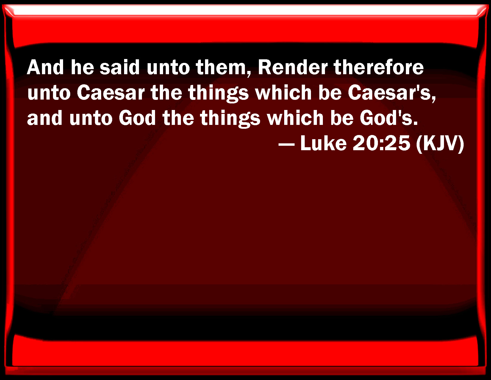 Bible Verse Slide Luke 20:25 And he said to them, Render therefore to Caesar the things which be Caesar's, and to God the things which be God's. KJV: And he said unto them, Render therefore unto Caesar the things which be Caesar's, and unto God the things which be God's. DRB: And he said to them: Render therefore to Caesar the things that are Caesar's: and to God the things that are God's. DBT: And he said to them, Pay therefore what is Caesar's to Caesar, and what is God's to God. ERV: And he said unto them, Then render unto Caesar the things that are Caesar's, and unto God the things that are God's. WBT: And he said to them, Render therefore to Cesar the things which are Cesar's, and to God the things which are God's. WEB: He said to them, "Then give to Caesar the things that are Caesar's, and to God the things that are God's." YLT: and he said to them, 'Give back, therefore, the things of Caesar to Caesar, and the things of God to God;'Links Luke 20:25 NIV • Luke 20:25 NLT • Luke 20:25 ESV • Luke 20:25 NASB • Luke 20:25 KJV • Luke 20:25 Interlinear • Luke 20:25 Commentaries • Luke 20:25 Parallel Texts • Luke 20:25 Bible Apps • Luke 20:25 Parallel • Bible Hub |