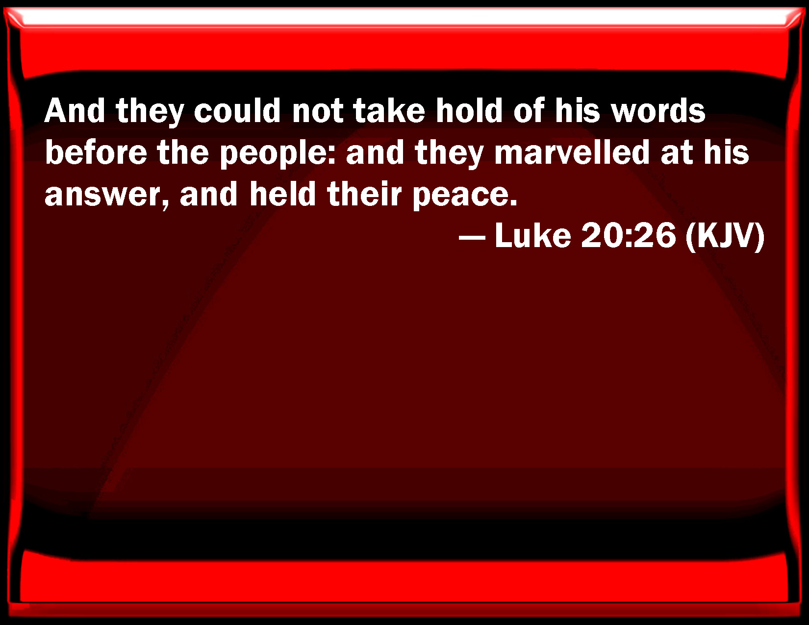 Bible Verse Slide Luke 20:26 And they could not take hold of his words before the people: and they marveled at his answer, and held their peace. KJV: And they could not take hold of his words before the people: and they marvelled at his answer, and held their peace. DRB: And they could not reprehend his word before the people: and wondering at his answer, they held their peace. DBT: And they were not able to take hold of him in his expressions before the people, and, wondering at his answer, they were silent. ERV: And they were not able to take hold of the saying before the people: and they marveled at his answer, and held their peace. WBT: And they could not take hold of his words before the people: and they marveled at his answer, and held their peace. WEB: They weren't able to trap him in his words before the people. They marveled at his answer, and were silent. YLT: and they were not able to take hold on his saying before the people, and having wondered at his answer, they were silent.Links Luke 20:26 NIV • Luke 20:26 NLT • Luke 20:26 ESV • Luke 20:26 NASB • Luke 20:26 KJV • Luke 20:26 Interlinear • Luke 20:26 Commentaries • Luke 20:26 Parallel Texts • Luke 20:26 Bible Apps • Luke 20:26 Parallel • Bible Hub |