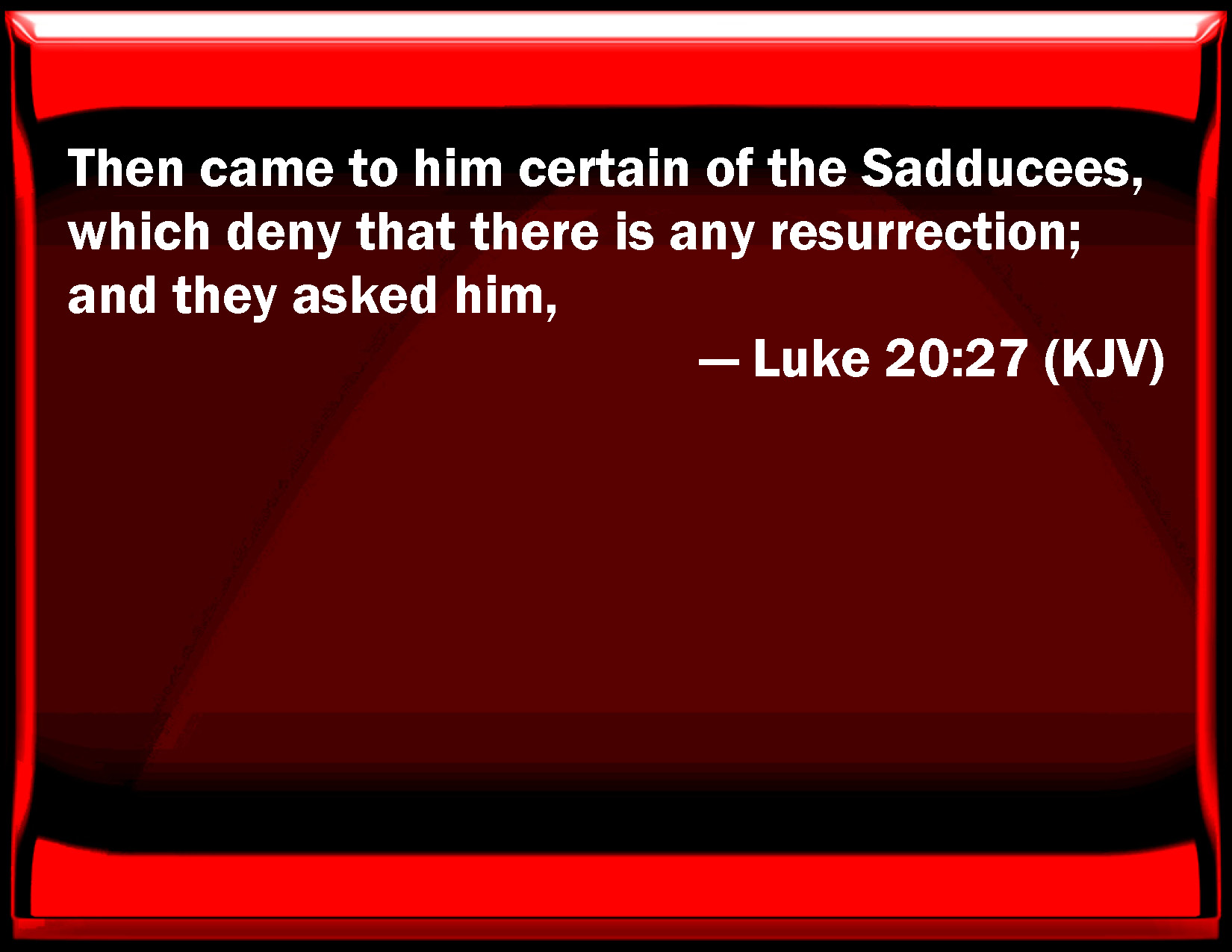 Bible Verse Slide Luke 20:27 Then came to him certain of the Sadducees, which deny that there is any resurrection; and they asked him, KJV: Then came to him certain of the Sadducees, which deny that there is any resurrection; and they asked him, DRB: And there came to him some of the Sadducees, who deny that there is any resurrection, and they asked him, DBT: And some of the Sadducees, who deny that there is any resurrection, coming up to him, ERV: And there came to him certain of the Sadducees, they which say that there is no resurrection; and they asked him, WBT: Then came to him certain of the Sadducees (who deny that there is any resurrection) and they asked him, WEB: Some of the Sadducees came to him, those who deny that there is a resurrection. YLT: And certain of the Sadducees, who are denying that there is a rising again, having come near, questioned him,Links Luke 20:27 NIV • Luke 20:27 NLT • Luke 20:27 ESV • Luke 20:27 NASB • Luke 20:27 KJV • Luke 20:27 Interlinear • Luke 20:27 Commentaries • Luke 20:27 Parallel Texts • Luke 20:27 Bible Apps • Luke 20:27 Parallel • Bible Hub |