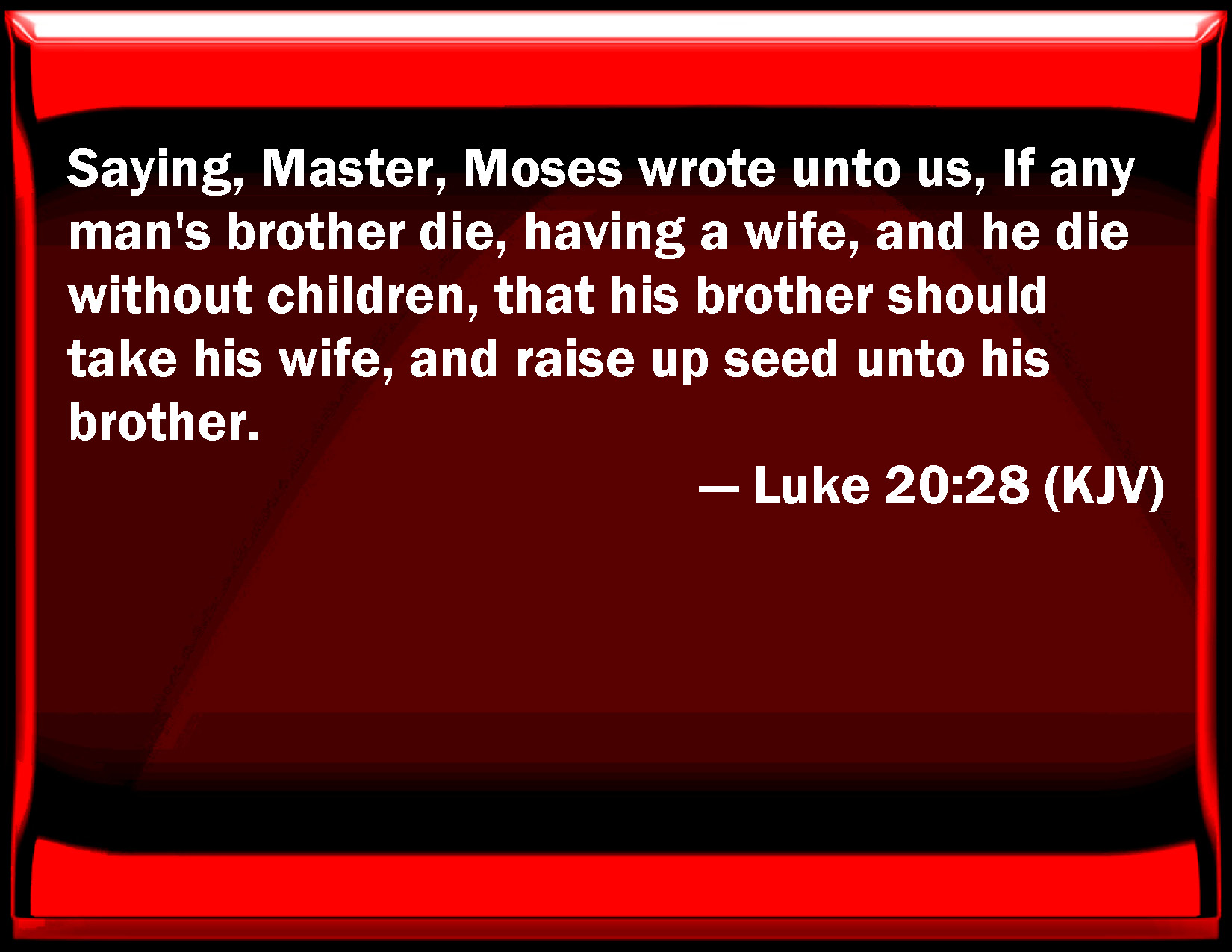 Bible Verse Slide Luke 20:28 Saying, Master, Moses wrote to us, If any man's brother die, having a wife, and he die without children, that his brother should take his wife, and raise up seed to his brother. KJV: Saying, Master, Moses wrote unto us, If any man's brother die, having a wife, and he die without children, that his brother should take his wife, and raise up seed unto his brother. DRB: Saying: Master, Moses wrote unto us, If any man's brother die, having a wife, and he leave no children, that his brother should take her to wife, and raise up seed unto his brother. DBT: demanded of him saying, Teacher, Moses wrote to us, If any one's brother, who has a wife, die, and he die childless, his brother shall take the wife and raise up seed to his brother. ERV: saying, Master, Moses wrote unto us, that if a man's brother die, having a wife, and he be childless, his brother should take the wife, and raise up seed unto his brother. WBT: Saying, Master, Moses wrote to us, If any man's brother should die, having a wife, and he should die without children, that his brother should take his wife, and raise up seed to his brother. WEB: They asked him, "Teacher, Moses wrote to us that if a man's brother dies having a wife, and he is childless, his brother should take the wife, and raise up children for his brother. YLT: saying, 'Teacher, Moses wrote to us, If any one's brother may die, having a wife, and he may die childless — that his brother may take the wife, and may raise up seed to his brother.Links Luke 20:28 NIV • Luke 20:28 NLT • Luke 20:28 ESV • Luke 20:28 NASB • Luke 20:28 KJV • Luke 20:28 Interlinear • Luke 20:28 Commentaries • Luke 20:28 Parallel Texts • Luke 20:28 Bible Apps • Luke 20:28 Parallel • Bible Hub |