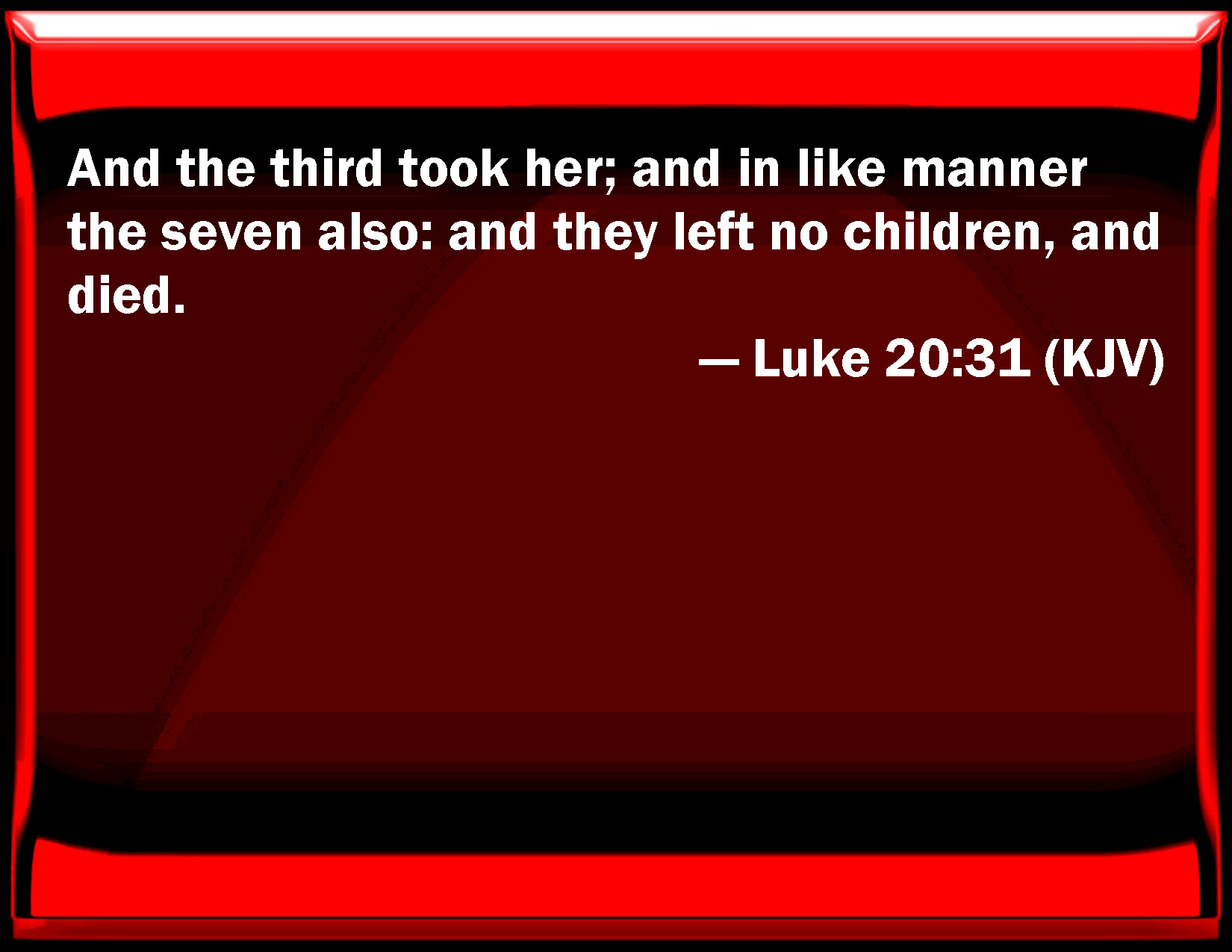 Bible Verse Slide Luke 20:31 And the third took her; and in like manner the seven also: and they left no children, and died. KJV: And the third took her; and in like manner the seven also: and they left no children, and died. DRB: And the third took her. And in like manner all the seven, and they left no children, and died. DBT: and the third took her: and in like manner also the seven left no children and died; ERV: and the third took her; and likewise the seven also left no children, and died. WBT: And the third took her; and in like manner the seven also: And they left no children, and died. WEB: The third took her, and likewise the seven all left no children, and died. YLT: and the third took her, and in like manner also the seven — they left not children, and they died;Links Luke 20:31 NIV • Luke 20:31 NLT • Luke 20:31 ESV • Luke 20:31 NASB • Luke 20:31 KJV • Luke 20:31 Interlinear • Luke 20:31 Commentaries • Luke 20:31 Parallel Texts • Luke 20:31 Bible Apps • Luke 20:31 Parallel • Bible Hub |