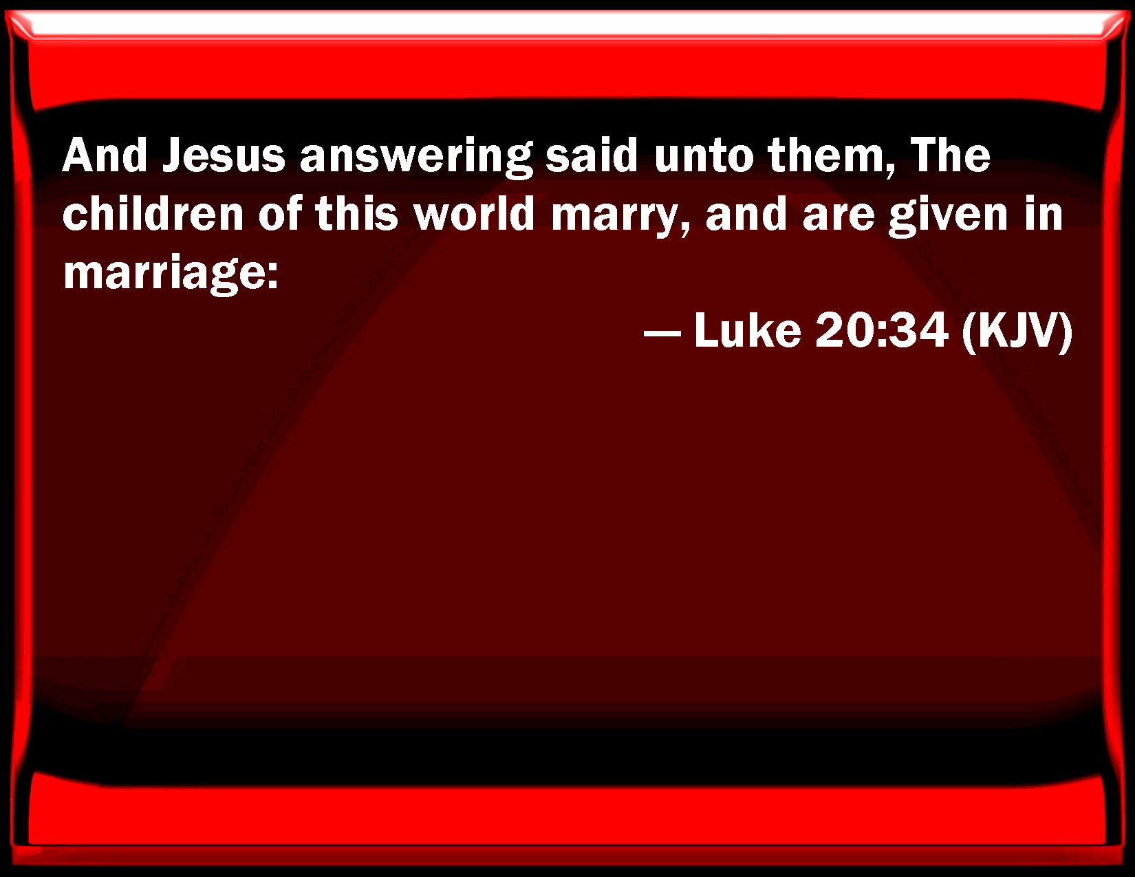 Bible Verse Slide Luke 20:34 And Jesus answering said to them, The children of this world marry, and are given in marriage: KJV: And Jesus answering said unto them, The children of this world marry, and are given in marriage: DRB: And Jesus said to them: The children of this world marry, and are given in marriage: DBT: And Jesus said to them, The sons of this world marry and are given in marriage, ERV: And Jesus said unto them, The sons of this world marry, and are given in marriage: WBT: And Jesus answering, said to them, The children of this world marry, and are given in marriage: WEB: Jesus said to them, "The children of this age marry, and are given in marriage. YLT: And Jesus answering said to them, 'The sons of this age do marry and are given in marriage,Links Luke 20:34 NIV • Luke 20:34 NLT • Luke 20:34 ESV • Luke 20:34 NASB • Luke 20:34 KJV • Luke 20:34 Interlinear • Luke 20:34 Commentaries • Luke 20:34 Parallel Texts • Luke 20:34 Bible Apps • Luke 20:34 Parallel • Bible Hub |