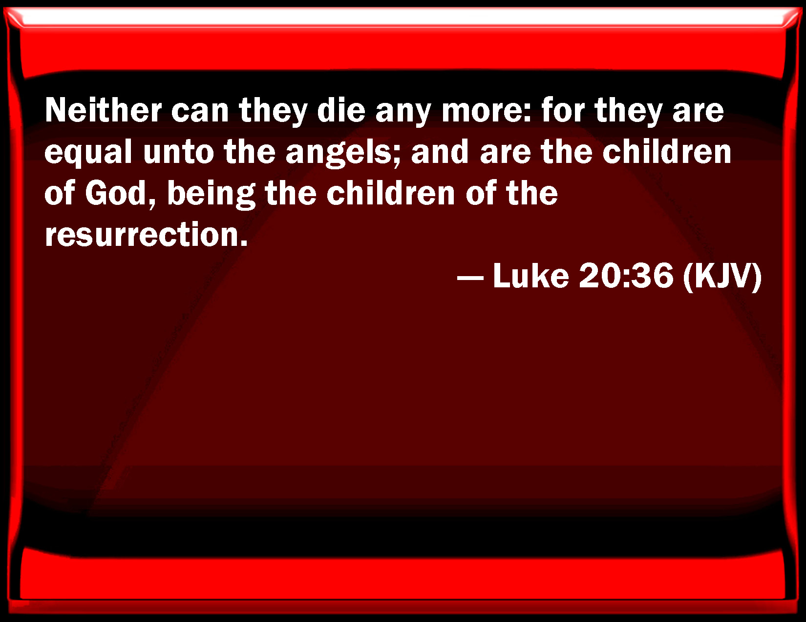Bible Verse Slide Luke 20:36 Neither can they die any more: for they are equal to the angels; and are the children of God, being the children of the resurrection. KJV: Neither can they die any more: for they are equal unto the angels; and are the children of God, being the children of the resurrection. DRB: Neither can they die any more: for they are equal to the angels, and are the children of God, being the children of the resurrection. DBT: for neither can they die any more, for they are equal to angels, and are sons of God, being sons of the resurrection. ERV: for neither can they die any more: for they are equal unto the angels; and are sons of God, being sons of the resurrection. WBT: Neither can they die any more: for they are equal to the angels; and are the children of God, being the children of the resurrection. WEB: For they can't die any more, for they are like the angels, and are children of God, being children of the resurrection. YLT: for neither are they able to die any more — for they are like messengers — and they are sons of God, being sons of the rising again.Links Luke 20:36 NIV • Luke 20:36 NLT • Luke 20:36 ESV • Luke 20:36 NASB • Luke 20:36 KJV • Luke 20:36 Interlinear • Luke 20:36 Commentaries • Luke 20:36 Parallel Texts • Luke 20:36 Bible Apps • Luke 20:36 Parallel • Bible Hub |