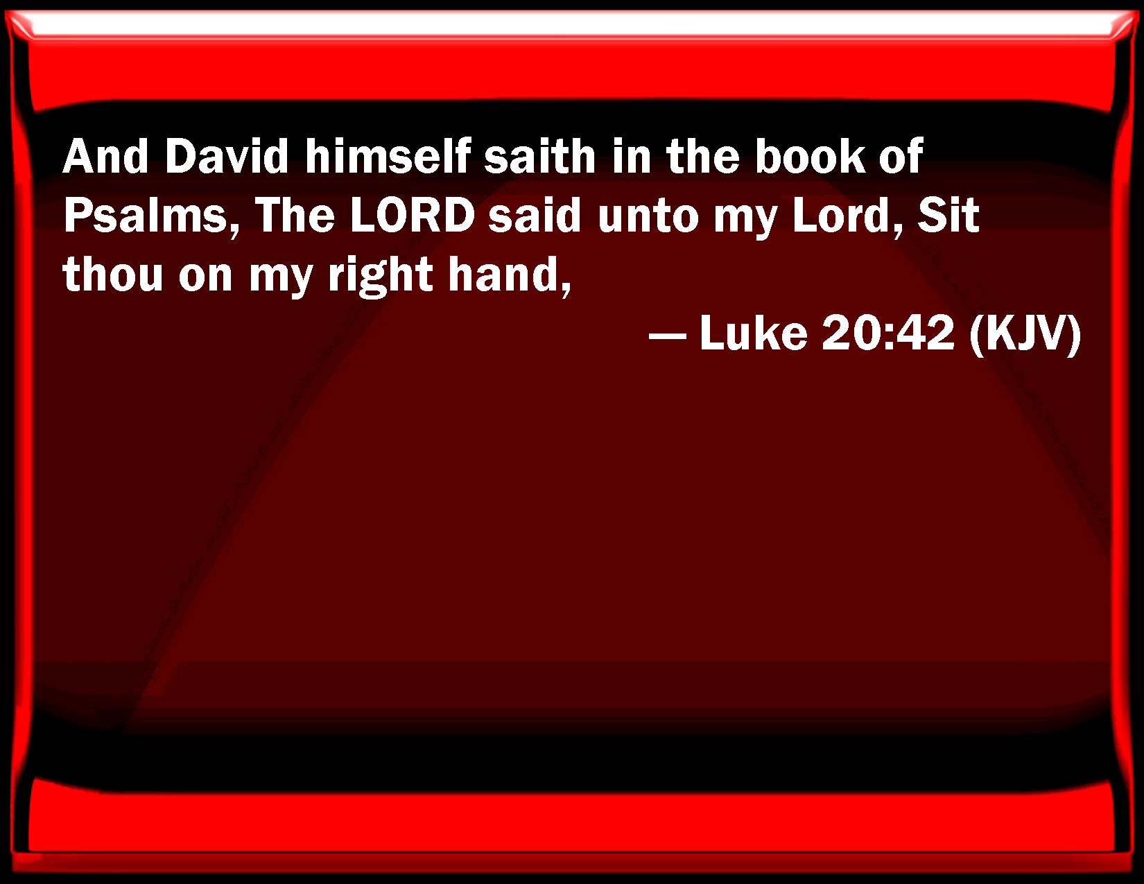 Bible Verse Slide Luke 20:42 And David himself said in the book of Psalms, The LORD said to my Lord, Sit you on my right hand, KJV: And David himself saith in the book of Psalms, The LORD said unto my Lord, Sit thou on my right hand, DRB: And David himself saith in the book of Psalms: The Lord said to my Lord, sit thou on my right hand, DBT: and David himself says in the book of Psalms, The Lord said to my Lord, Sit at my right hand ERV: For David himself saith in the book of Psalms, The Lord said unto my Lord, Sit thou on my right hand, WBT: And David himself saith in the book of Psalms, The LORD said to my Lord, Sit thou on my right hand, WEB: David himself says in the book of Psalms, 'The Lord said to my Lord, "Sit at my right hand, YLT: and David himself saith in the Book of Psalms, The Lord said to my lord, Sit thou on my right hand,Links Luke 20:42 NIV • Luke 20:42 NLT • Luke 20:42 ESV • Luke 20:42 NASB • Luke 20:42 KJV • Luke 20:42 Interlinear • Luke 20:42 Commentaries • Luke 20:42 Parallel Texts • Luke 20:42 Bible Apps • Luke 20:42 Parallel • Bible Hub |