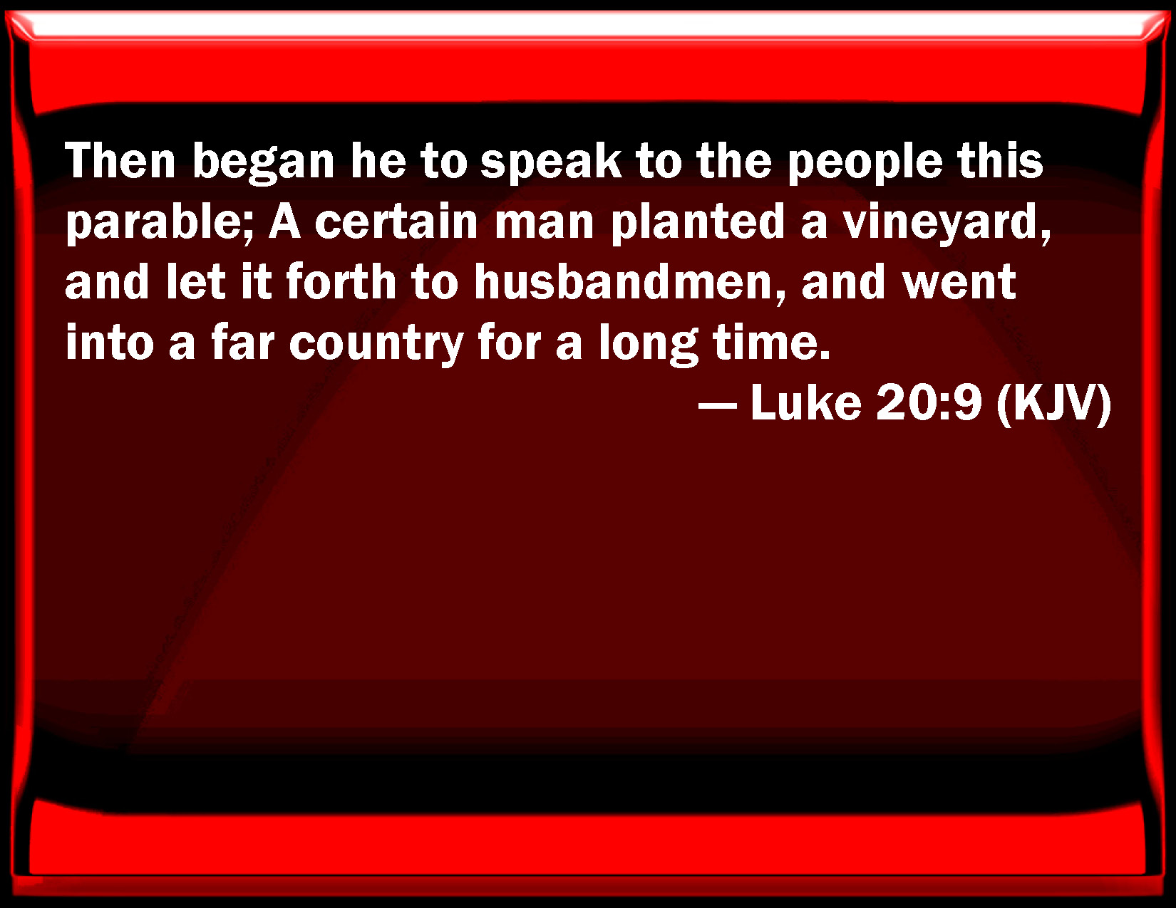 Bible Verse Slide Luke 20:9 Then began he to speak to the people this parable; A certain man planted a vineyard, and let it forth to farmers, and went into a far country for a long time. KJV: Then began he to speak to the people this parable; A certain man planted a vineyard, and let it forth to husbandmen, and went into a far country for a long time. DRB: And he began to speak to the people this parable: A certain man planted a vineyard, and let it out to husbandmen: and he was abroad for a long time. DBT: And he began to speak to the people this parable: A man planted a vineyard and let it out to husbandmen, and left the country for a long time. ERV: And he began to speak unto the people this parable: A man planted a vineyard, and let it out to husbandmen, and went into another country for a long time. WBT: Then he began to speak to the people this parable; A certain man planted a vineyard, and let it to husbandmen, and went into a far country for a long time. WEB: He began to tell the people this parable. "A man planted a vineyard, and rented it out to some farmers, and went into another country for a long time. YLT: And he began to speak unto the people this simile: 'A certain man planted a vineyard, and gave it out to husbandmen, and went abroad for a long time,Links Luke 20:9 NIV • Luke 20:9 NLT • Luke 20:9 ESV • Luke 20:9 NASB • Luke 20:9 KJV • Luke 20:9 Interlinear • Luke 20:9 Commentaries • Luke 20:9 Parallel Texts • Luke 20:9 Bible Apps • Luke 20:9 Parallel • Bible Hub |