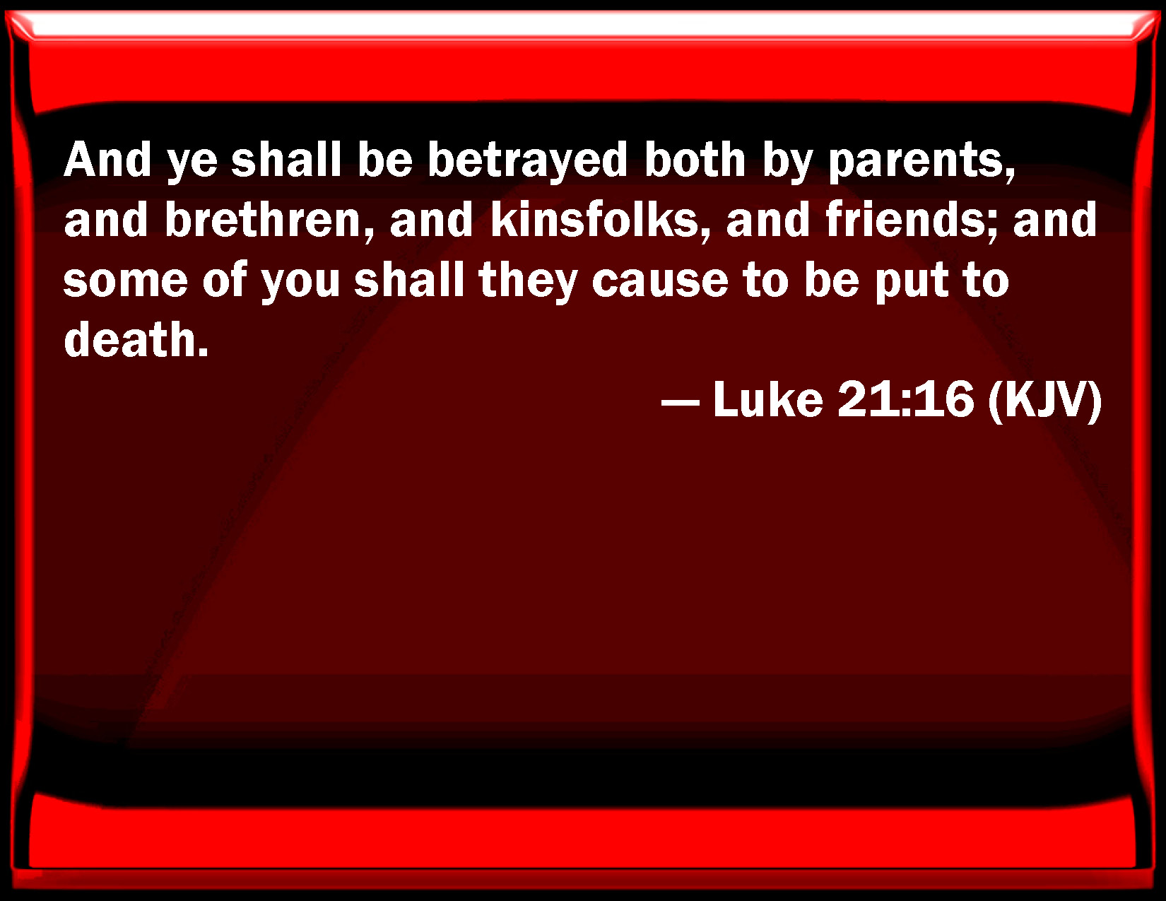 Bible Verse Slide Luke 21:16 And you shall be betrayed both by parents, and brothers, and kinfolks, and friends; and some of you shall they cause to be put to death. KJV: And ye shall be betrayed both by parents, and brethren, and kinsfolks, and friends; and some of you shall they cause to be put to death. DRB: And you shall be betrayed by your parents and brethren, and kinsmen and friends; and some of you they will put to death. DBT: But ye will be delivered up even by parents and brethren and relations and friends, and they shall put to death some from among you, ERV: But ye shall be delivered up even by parents, and brethren, and kinsfolk, and friends; and some of you shall they cause to be put to death. WBT: And ye will be betrayed both by parents, and brethren, and kinsmen, and friends; and some of you will they cause to be put to death. WEB: You will be handed over even by parents, brothers, relatives, and friends. They will cause some of you to be put to death. YLT: 'And ye shall be delivered up also by parents, and brothers, and kindred, and friends, and they shall put of you to death;Links Luke 21:16 NIV • Luke 21:16 NLT • Luke 21:16 ESV • Luke 21:16 NASB • Luke 21:16 KJV • Luke 21:16 Interlinear • Luke 21:16 Commentaries • Luke 21:16 Parallel Texts • Luke 21:16 Bible Apps • Luke 21:16 Parallel • Bible Hub |