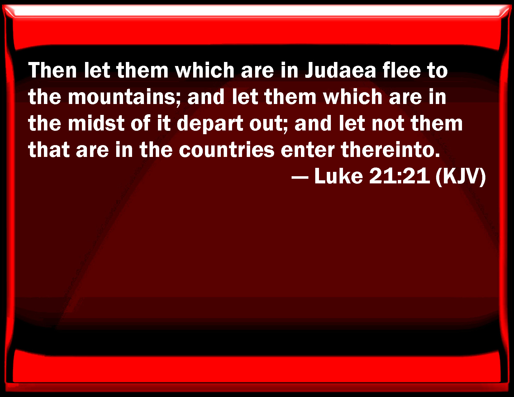 Luke 21:21 Then let them which are in Judaea flee to the mountains; and let them which are in the middle of it depart out; and let not them that are in the countries enter thereinto.