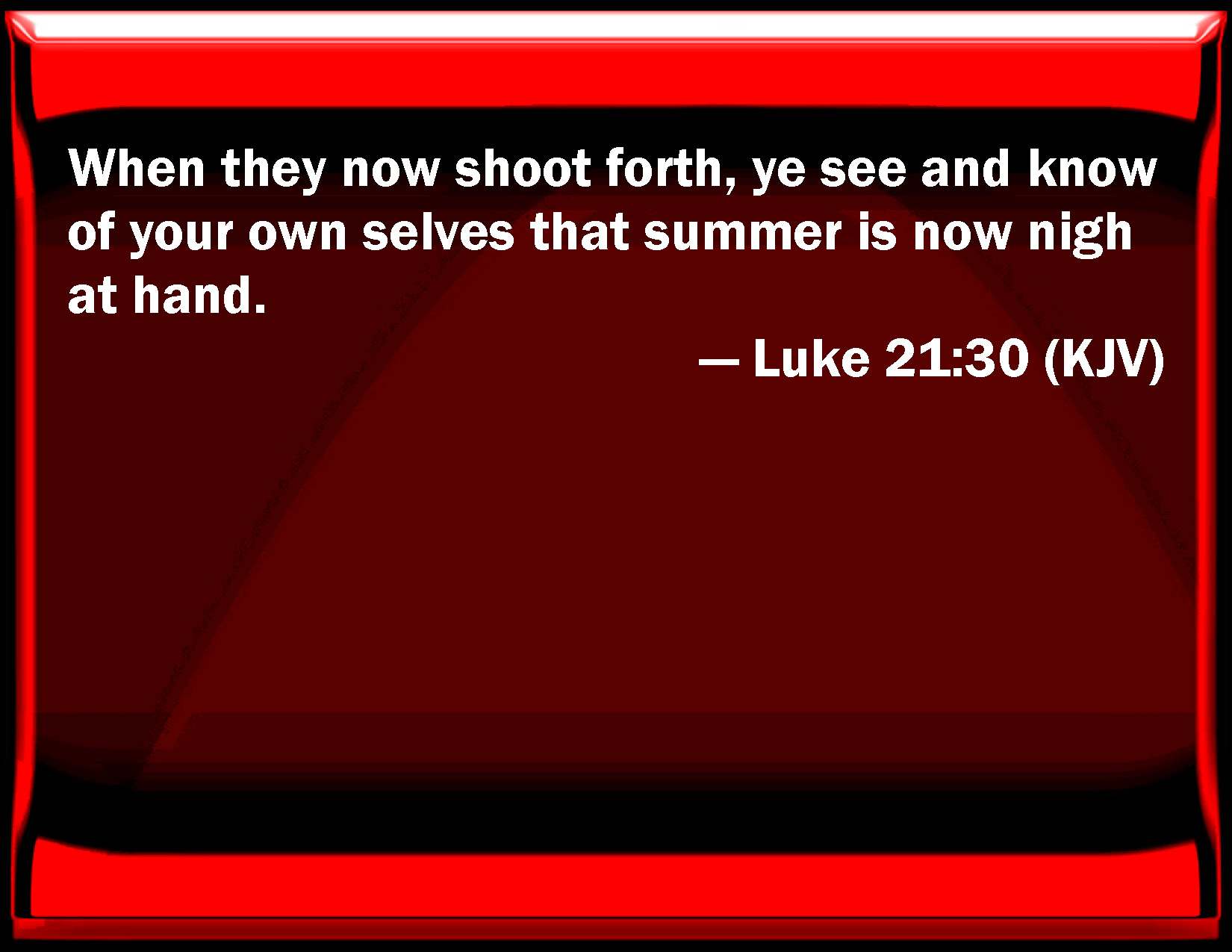 Bible Verse Slide Luke 21:30 When they now shoot forth, you see and know of your own selves that summer is now near at hand. KJV: When they now shoot forth, ye see and know of your own selves that summer is now nigh at hand. DRB: When they now shoot forth their fruit, you know that summer is nigh; DBT: when they already sprout, ye know of your own selves, on looking at them, that already the summer is near. ERV: when they now shoot forth, ye see it and know of your own selves that the summer is now nigh. WBT: When they now shoot forth, ye see and know of your ownselves that summer is now nigh at hand. WEB: When they are already budding, you see it and know by your own selves that the summer is already near. YLT: when they may now cast forth, having seen, of yourselves ye know that now is the summer nigh;Links Luke 21:30 NIV • Luke 21:30 NLT • Luke 21:30 ESV • Luke 21:30 NASB • Luke 21:30 KJV • Luke 21:30 Interlinear • Luke 21:30 Commentaries • Luke 21:30 Parallel Texts • Luke 21:30 Bible Apps • Luke 21:30 Parallel • Bible Hub |