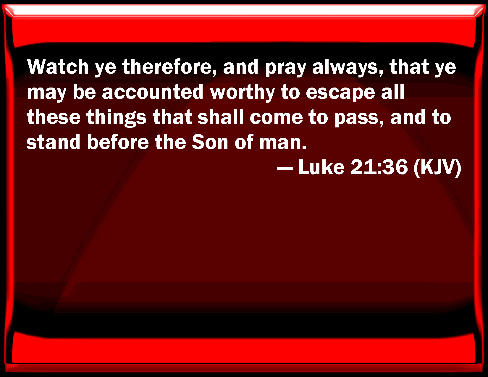 Bible Verse Slide Luke 21:36 Watch you therefore, and pray always, that you may be accounted worthy to escape all these things that shall come to pass, and to stand before the Son of man. KJV: Watch ye therefore, and pray always, that ye may be accounted worthy to escape all these things that shall come to pass, and to stand before the Son of man. DRB: Watch ye, therefore, praying at all times, that you may be accounted worthy to escape all these things that are to come, and to stand before the Son of man. DBT: Watch therefore, praying at every season, that ye may be accounted worthy to escape all these things which are about to come to pass, and to stand before the Son of man. ERV: But watch ye at every season, making supplication, that ye may prevail to escape all these things that shall come to pass, and to stand before the Son of man. WBT: Watch ye therefore, and pray always, that ye may be accounted worthy to escape all these things that shall come to pass, and to stand before the Son of man. WEB: Therefore be watchful all the time, praying that you may be counted worthy to escape all these things that will happen, and to stand before the Son of Man." YLT: watch ye, then, in every season, praying that ye may be accounted worthy to escape all these things that are about to come to pass, and to stand before the Son of Man.'Links Luke 21:36 NIV • Luke 21:36 NLT • Luke 21:36 ESV • Luke 21:36 NASB • Luke 21:36 KJV • Luke 21:36 Interlinear • Luke 21:36 Commentaries • Luke 21:36 Parallel Texts • Luke 21:36 Bible Apps • Luke 21:36 Parallel • Bible Hub |