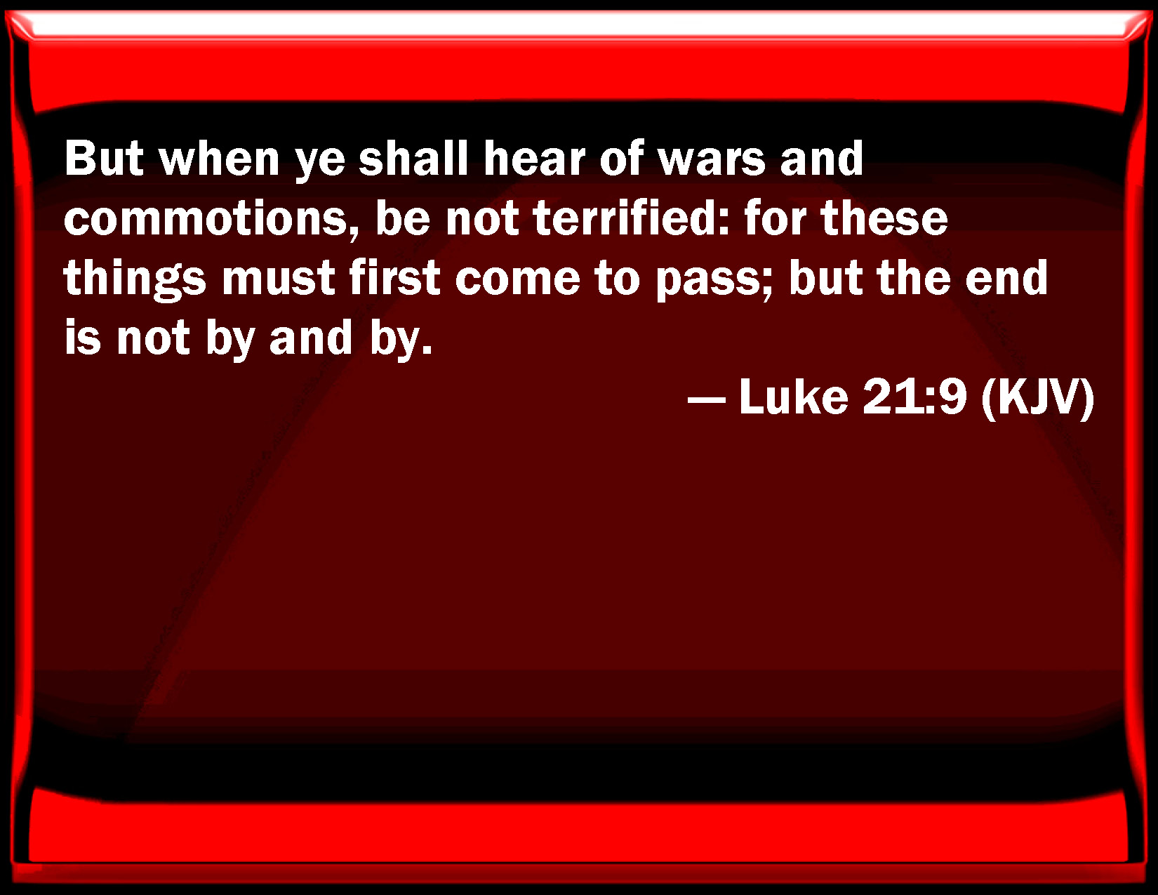 Bible Verse Slide Luke 21:9 But when you shall hear of wars and commotions, be not terrified: for these things must first come to pass; but the end is not by and by. KJV: But when ye shall hear of wars and commotions, be not terrified: for these things must first come to pass; but the end is not by and by. DRB: And when you shall hear of wars and seditions, be not terrified: these things must first come to pass; but the end is not yet presently. DBT: And when ye shall hear of wars and tumults, be not terrified, for these things must first take place, but the end is not immediately. ERV: And when ye shall hear of wars and tumults, be not terrified: for these things must needs come to pass first; but the end is not immediately. WBT: But when ye shall hear of wars, and commotions, be not terrified: for these things must first come to pass: but the end is not immediately. WEB: When you hear of wars and disturbances, don't be terrified, for these things must happen first, but the end won't come immediately." YLT: and when ye may hear of wars and uprisings, be not terrified, for it behoveth these things to happen first, but the end is not immediately.'Links Luke 21:9 NIV • Luke 21:9 NLT • Luke 21:9 ESV • Luke 21:9 NASB • Luke 21:9 KJV • Luke 21:9 Interlinear • Luke 21:9 Commentaries • Luke 21:9 Parallel Texts • Luke 21:9 Bible Apps • Luke 21:9 Parallel • Bible Hub |