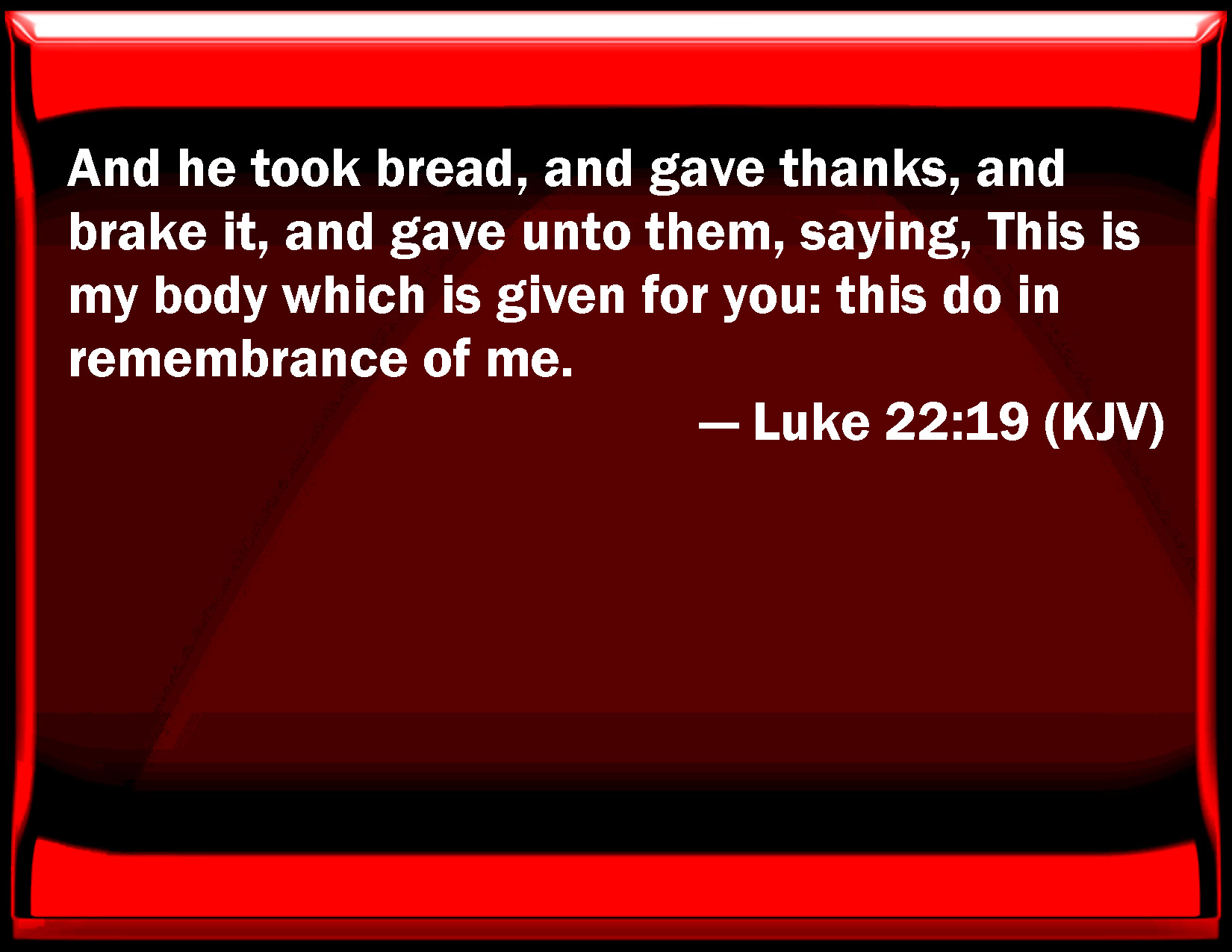 Bible Verse Slide Luke 22:19 And he took bread, and gave thanks, and broke it, and gave to them, saying, This is my body which is given for you: this do in remembrance of me. KJV: And he took bread, and gave thanks, and brake it, and gave unto them, saying, This is my body which is given for you: this do in remembrance of me. DRB: And taking bread, he gave thanks, and brake; and gave to them, saying: This is my body, which is given for you. Do this for a commemoration of me. DBT: And having taken a loaf, when he had given thanks, he broke it, and gave it to them, saying, This is my body which is given for you: this do in remembrance of me. ERV: And he took bread, and when he had given thanks, he brake it, and gave to them, saying, This is my body which is given for you: this do in remembrance of me. WBT: And he took bread, and gave thanks, and broke it, and gave to them, saying, This is my body which is given for you: this do in remembrance of me. WEB: He took bread, and when he had given thanks, he broke it, and gave to them, saying, "This is my body which is given for you. Do this in memory of me." YLT: And having taken bread, having given thanks, he brake and gave to them, saying, 'This is my body, that for you is being given, this do ye — to remembrance of me.'Links Luke 22:19 NIV • Luke 22:19 NLT • Luke 22:19 ESV • Luke 22:19 NASB • Luke 22:19 KJV • Luke 22:19 Interlinear • Luke 22:19 Commentaries • Luke 22:19 Parallel Texts • Luke 22:19 Bible Apps • Luke 22:19 Parallel • Bible Hub |
